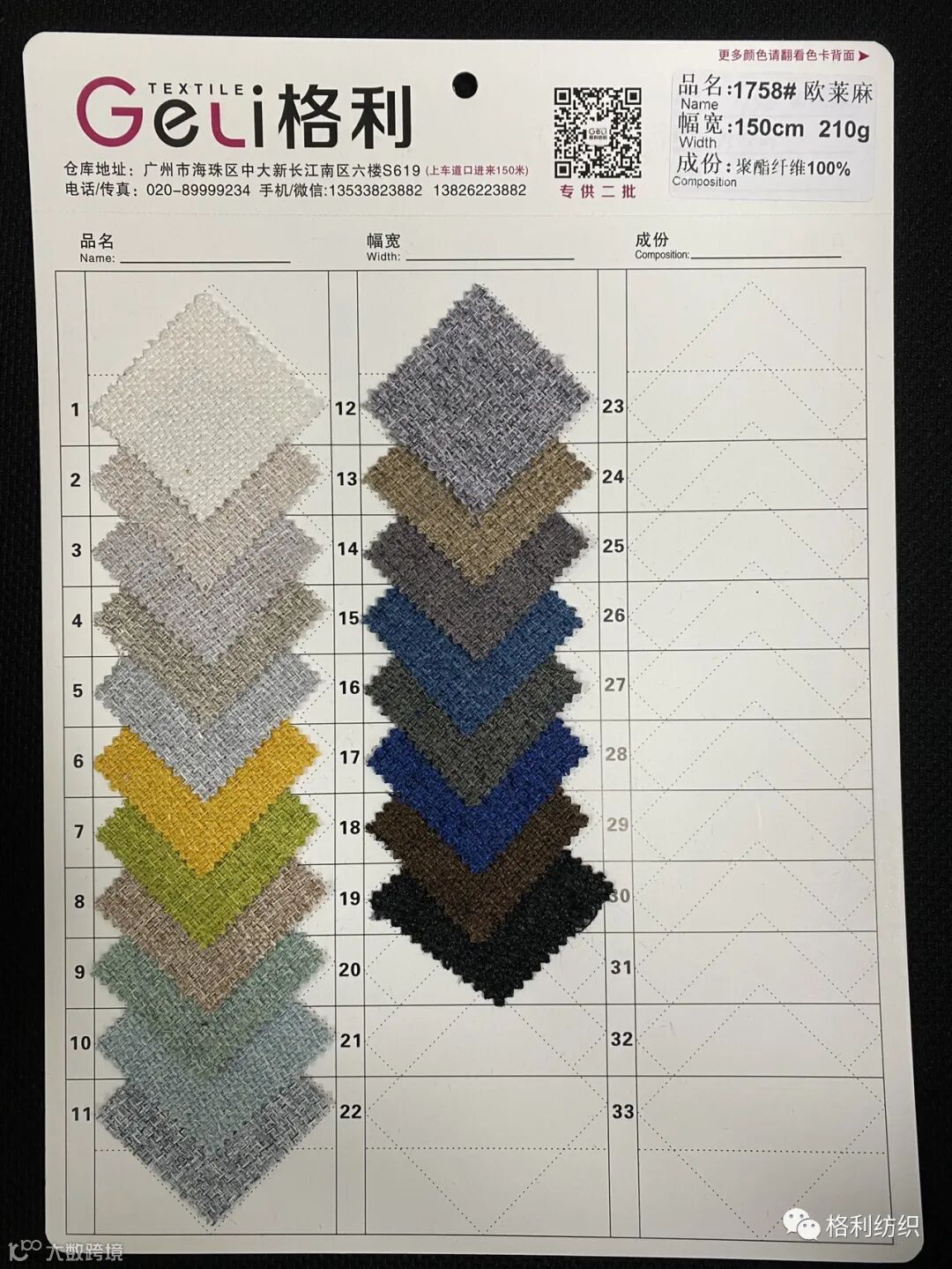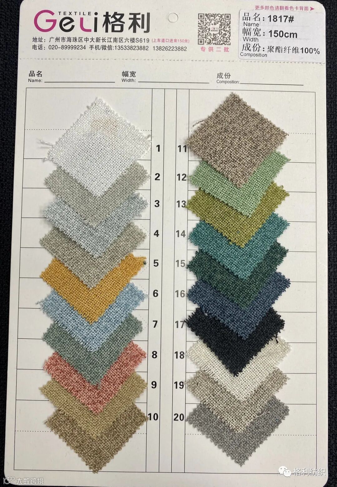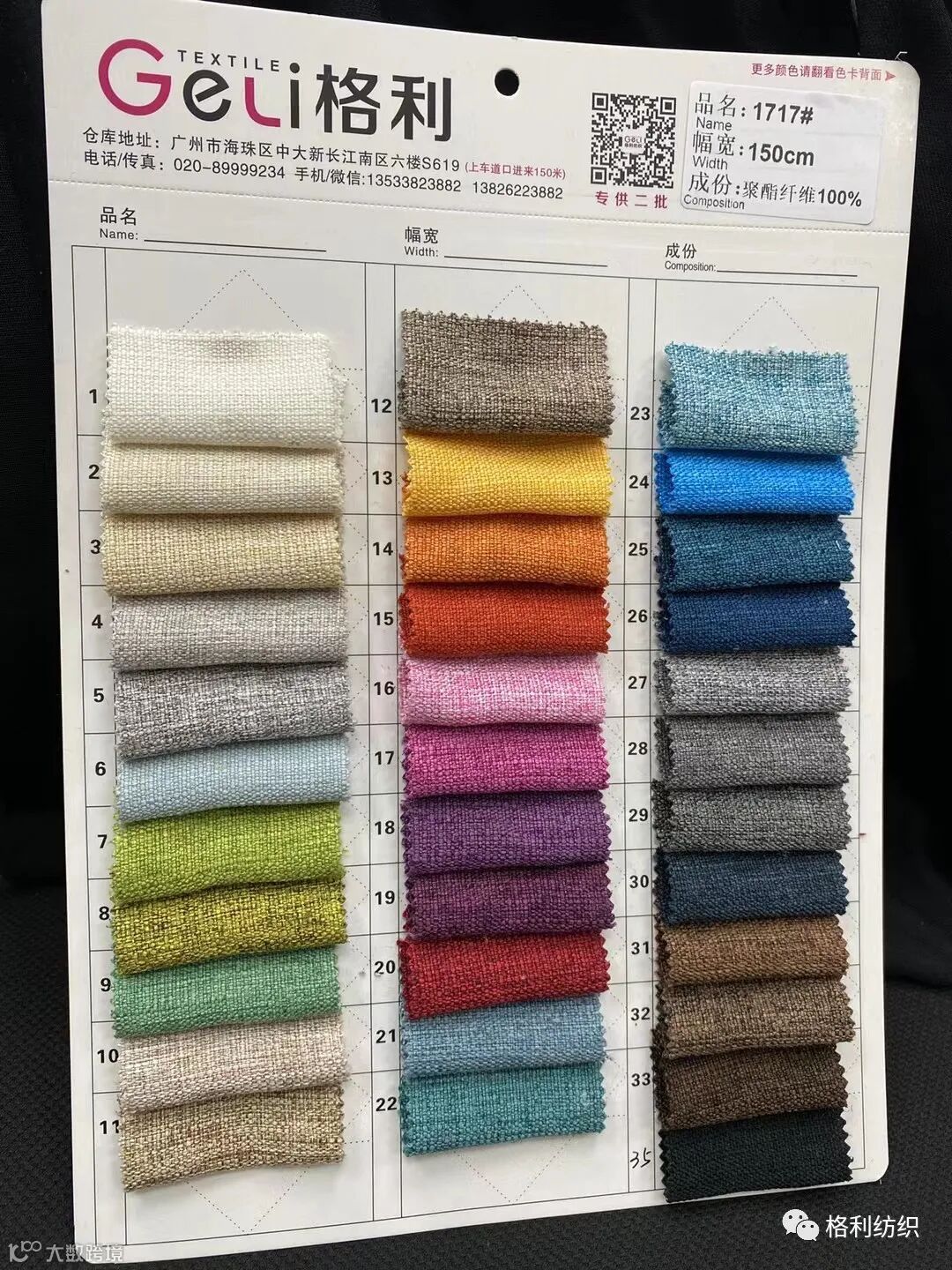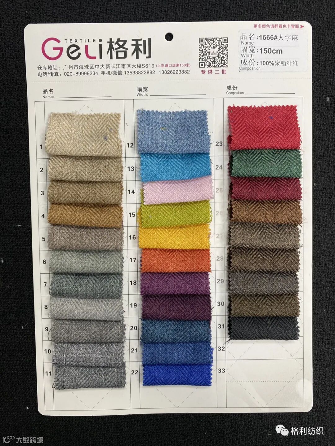 感谢您关注广州新格利®纺织 ,我公司专业从事面料生产开发,TR色织格条,素色小香风,TR双色乐丽丝系列。欢迎广大客户前来咨询采购!地址:广州市海珠区中大新长江北区三楼N3183。☎️电话020 89999234 手机:13826223882