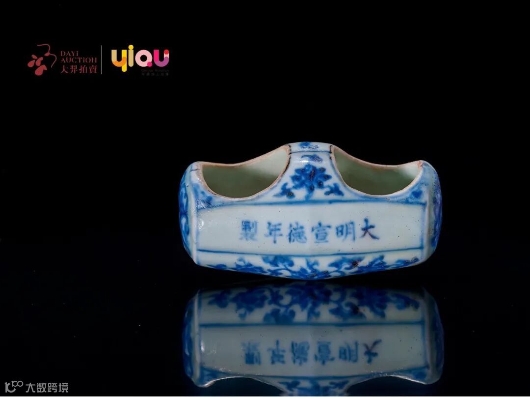 比如LOT133 宣德青花缠枝花卉纹鸟食罐,罐身缠枝莲纹仍带苏麻离青的晕散质感,但线条更利落、结构更规整,花瓣通过青料浓淡差异呈现出立体感,一改永乐的豪放,多了几分精致。本品呈鼓形,开两倭角长方形口,一面出两小圆形系,通体施白釉,釉面肥腴,两头呈花瓣状,以青花随形绘花卉两朵,器身随花瓣凸起,器身以青花绘缠枝莲纹,一面莲纹间留白书“大明宣德年製”六字单行楷书款,书写端正,遒劲有力,是为明代馆阁体。