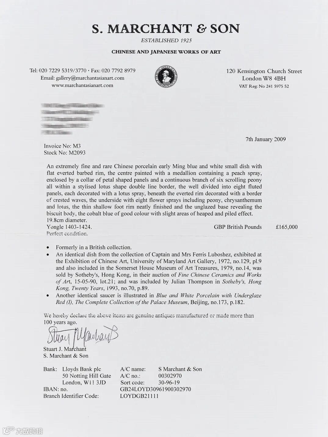 此盘不仅传承有序,曾为英国著名古董商马钱特(S. Marchant & Son)旧藏,更以其卓越的艺术品质和保存状态,成为本季拍卖市场最令人期待的永乐青花珍品之一。