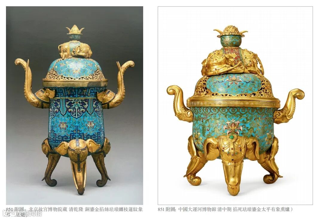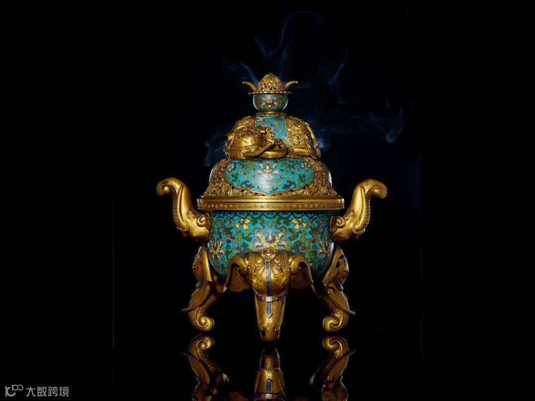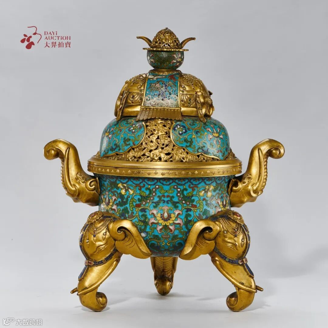 整器制作精良考究,色料纯正,可堪玩赏。 本器珐琅彩釉鲜明艳丽,象首足形体硕大,气势朗阔,整体富丽堂皇,体现了清代鼎盛时期掐丝珐琅工艺达到巅峰。在中国“象”象征着强壮、智慧、聪明以及永久的和谐,故古代中国常以象作为器物的装饰。本盖炉也表现出古人十分推崇负有吉祥寓意的文化艺术,象托宝瓶,故有「太平有象」之说,寓意天下太平、五谷丰登。