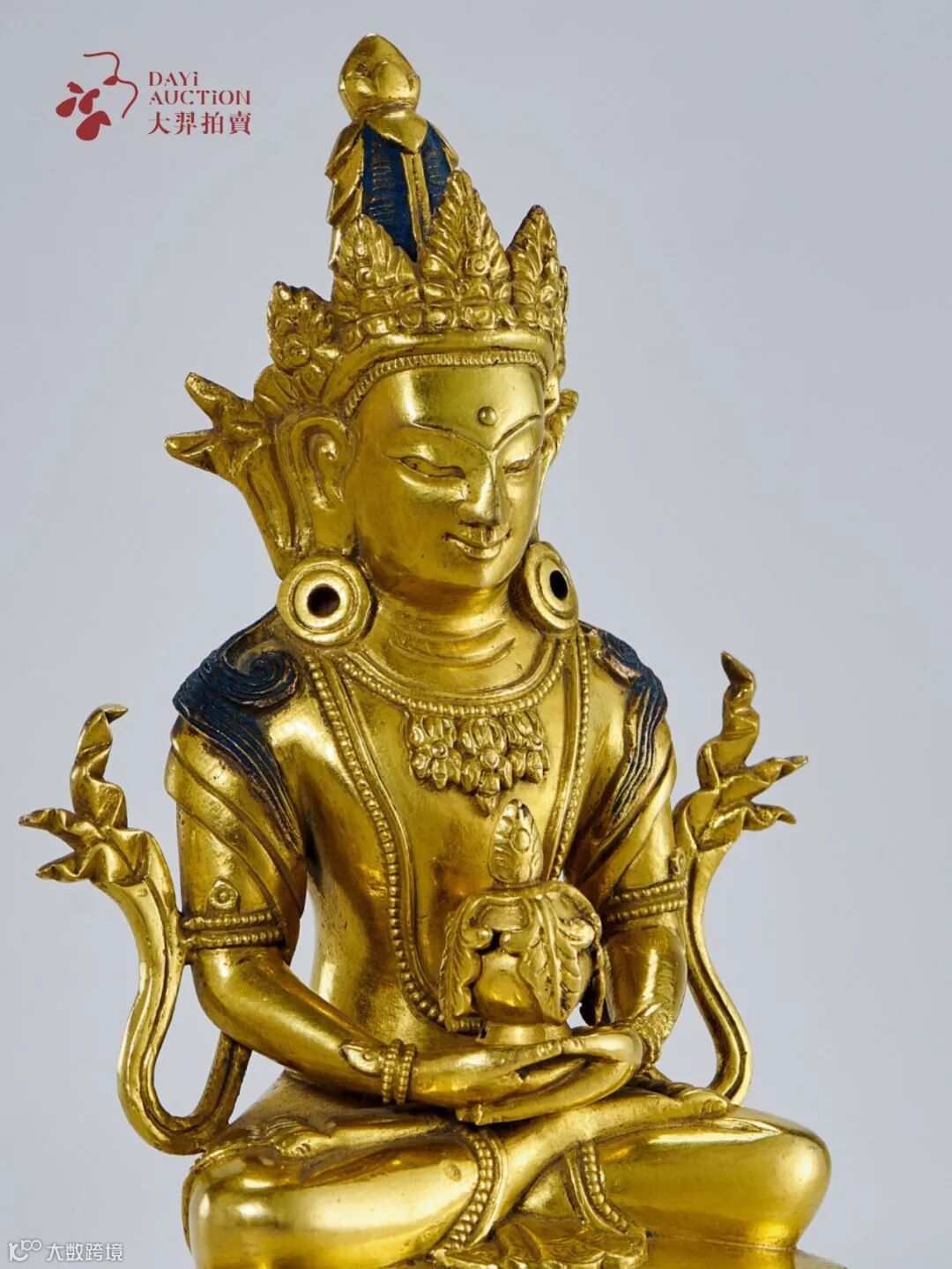 此尊像结跏趺端坐于仰覆莲台座上,双目微垂,面目慈祥,大耳垂肩,并佩大耳铛;头顶梳高发髻,发髻顶端有饰物,头戴宝冠,宝冠两侧之宝缯飘于耳后;双手于脐前结定印,双臂饰有臂钏、手钏。上身袒露,胸、腹部饰有璎珞,肩披披帛,披帛分别绕过两臂垂于体侧。台座采用仰覆莲瓣装饰,整尊造像造型端庄。除发髻等处外,外部通体鎏金,保存较为完整。