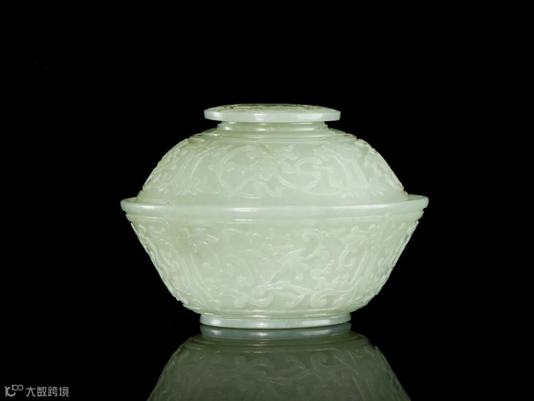 此白玉八吉祥盖碗以白玉为料,温润晶莹,呈凝油脂光泽,碗分为盖、身两部分,盖钮凸刻花瓣纹饰,盖面与碗身碾琢佛门八宝,碗足微外撇,此器刀工深峻,线条细润,富有浓郁的宫廷气息,是难得一见的精品。