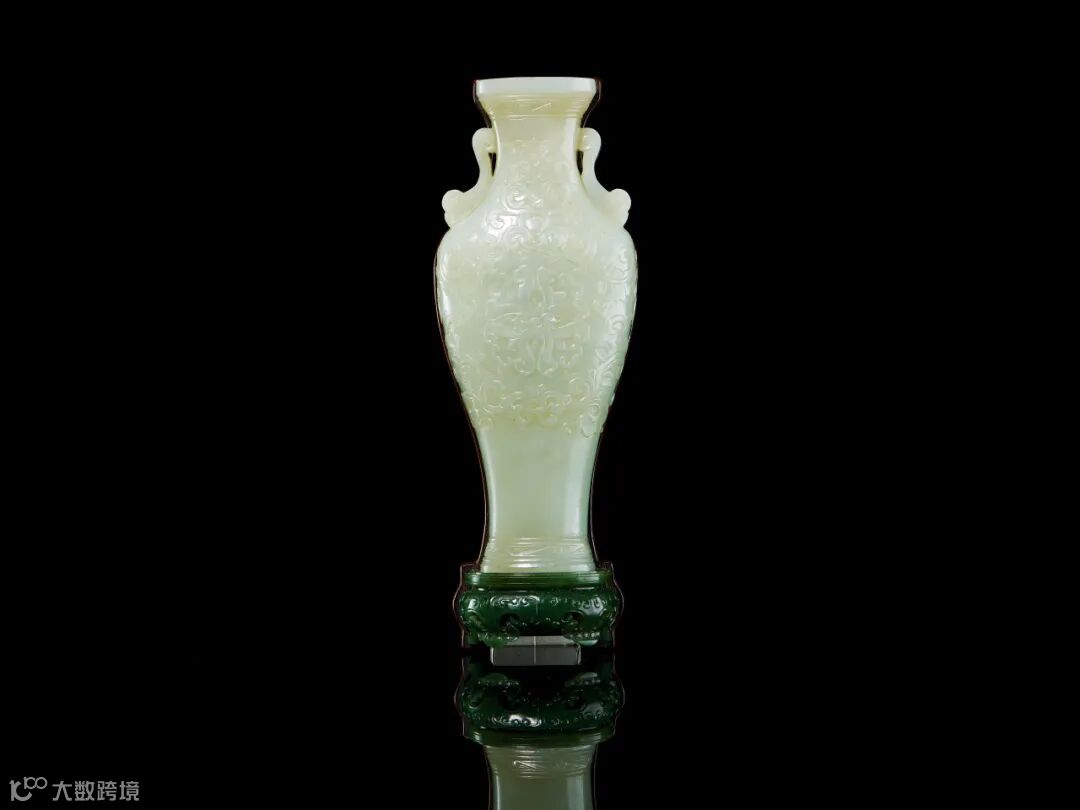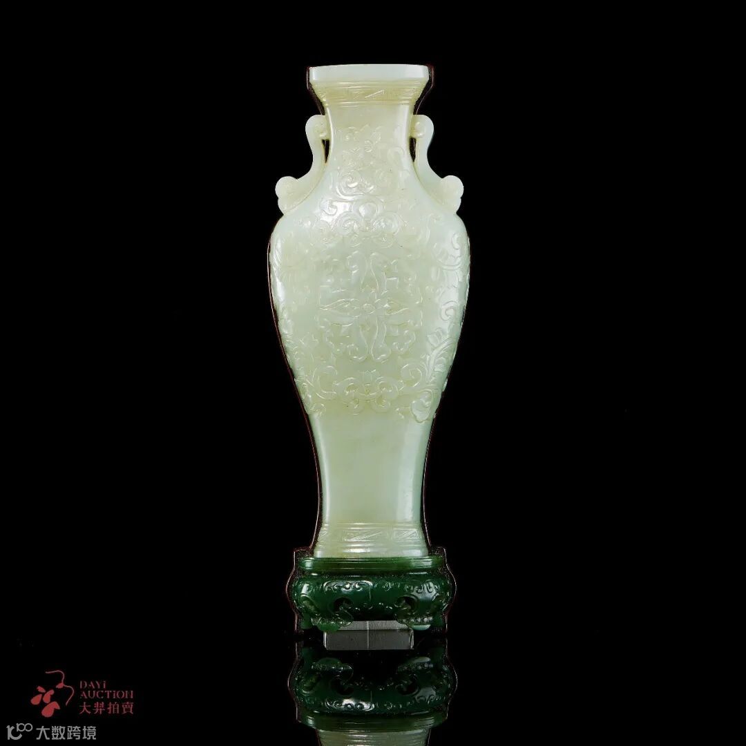 壁瓶,为诸多瓶式的一种,以挂于壁面而名,又称“轿瓶”、挂瓶。器型为常见花瓶、 尊等竖部的一半,靠壁一面平坦有孔,以利于悬挂于墙壁上,做家居装饰之用。万曆年间《遵生八笺》一书记载“四时插花,人作花伴,清芬满床,卧之神爽意快,冬夏两可”。可见,当时文人对壁瓶的喜爱。 此瓶精选上好玉料,玉质细腻润泽。瓶直口,颈饰双耳,修肩,瓶通体雕缠枝宝相花,腹部雕团花一朵,工艺精湛。全器造型饱满,线条流畅,刻工精细,纹饰繁复中透出清雅,整体设计大方典雅。