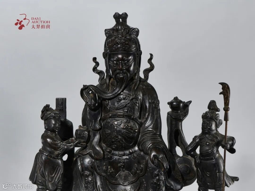 在关公的两侧侍立两将,分别为关平和周仓。其中关平捧印,谦恭儒雅;周仓提刀,面露忠勇。关平原为冀州关定之子,关羽过五关斩六将时收其为义子,从此作为关羽的副将,南征北战。周仓初为黄巾军张宝的部将,后在卧牛山投奔关羽,并随之出生入死,也为一位忠义之士。关公组像完整传世,实属难得。