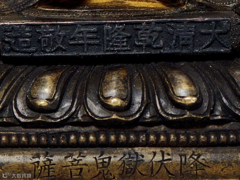 黄铜铸造,肉身泥金,做工精细,用铜厚重,属六品造像中的精品。从泥金的效果来看,厚度均匀,金色沉稳,不像是后人所涂,应是旧金,此尊头戴五叶宝冠,披条帛,饰璎珞,作菩萨妆束。右手施无畏印,左手托举金刚钵,以表现其强大的法力。台座上沿有“大清乾隆年敬造”款,下沿有“降伏狱鬼菩萨”六字。