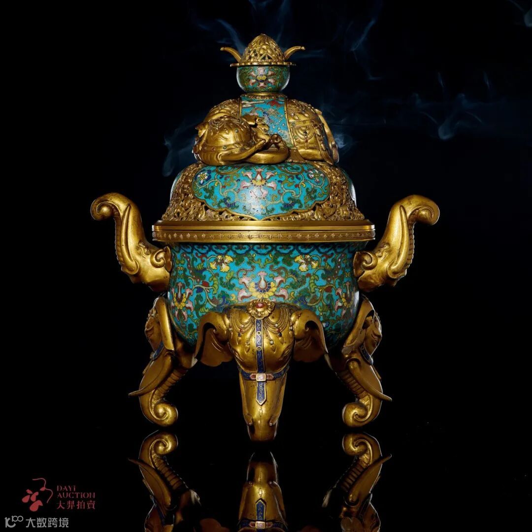 铜鎏金掐丝珐琅缠枝莲纹象耳三足炉