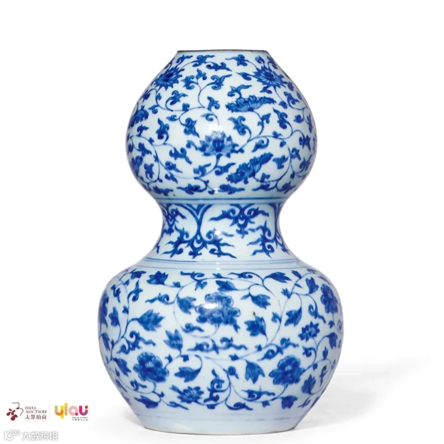 嘉靖皇帝尊崇道教,痴迷炼丹修斋,日求长生不老,故用以盛装仙丹的葫芦瓶造型风行一时,极具时代特色。此瓶器形端正,呈葫芦形,小圆口,短直颈,束腰,双鼓腹,成型难度较大。瓶身上下青花绘缠枝牡丹纹和缠枝莲纹图案,寓意万年富贵,腰部绘如意卷草纹,通体青花发色鲜艳,画工遒丽劲道,为明代青花瓷绘之佳作。