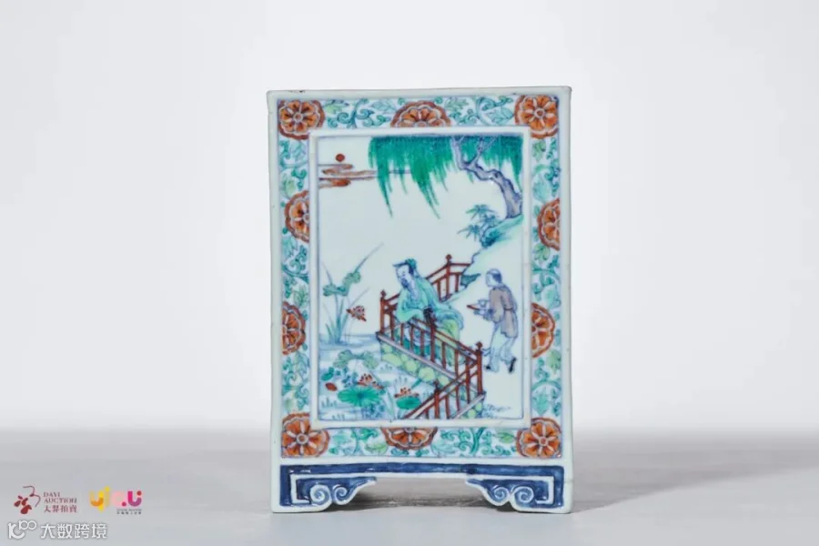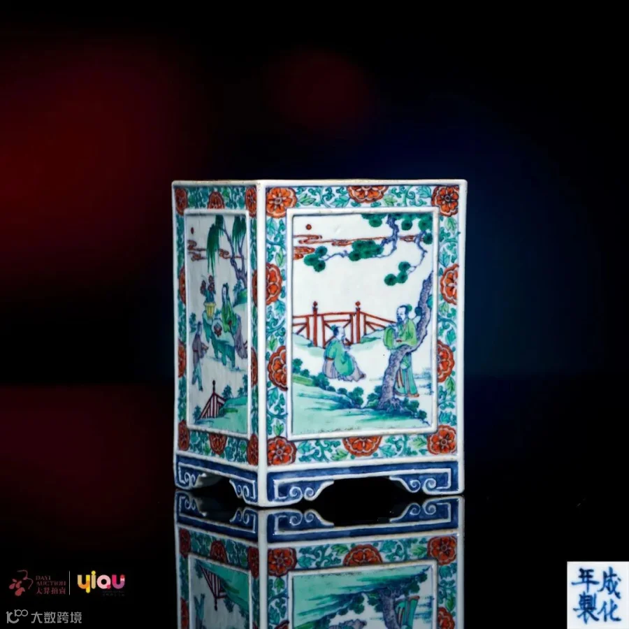 笔筒四方形,下承如意形四足,造型坚毅秀挺。器身纹饰皆以斗彩绘就,四面设长方形开光,外环缠枝花卉纹,内绘四爱人物图,苍松茂荫,长者凭栏,幼者携至,主题鲜明。造型秀雅中不失周正古朴之气,既可掌中把玩,又富于实用性,赏玩之时更助文人雅趣,殊堪珍赏。