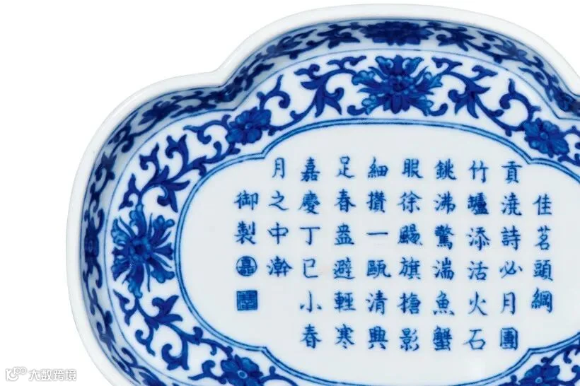 拍品为饮茶用具,内外以青花缠枝莲纹装饰,中心为海棠形开光,开光外围饰一圈缠枝牡丹纹,开光内绘青花御题嘉庆帝的一首烹茶五言律诗:“佳茗头纲贡,浇诗必月团。竹炉添活火,石铫沸惊湍。鱼蟹眼徐扬,旗枪影细攒。一瓯清兴足,春盎避清寒。”诗后款署“嘉庆丁已小春月之中澣御制”,钤“嘉”“庆”两印。整体绘画精细严谨,书写工整,生动地描绘出春夜皇帝品缆新茶之情景。