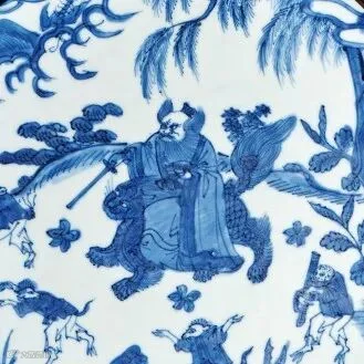 拍品纹饰为钟馗出行图,整体构图繁密热闹,画笔自然清逸。钟馗身骑麒麟,手握宝剑,龙眉巨目,精神抖擞,众小鬼畏缩讨好,人物神态与自然景致都极为生动。寥寥几笔却不失生动,画风拙朴,颇具时代气息。青花线条流畅,笔触清晰,遒劲有力,青花发色浓艳深沉,蓝中泛紫,属于万曆青花上等发色,后背落“大明万曆年制”六字双行楷书款,为万曆官窑青花精品。