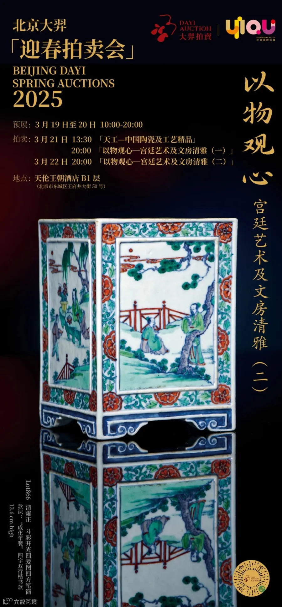 北京大羿2025迎春拍卖会已于3月19日在天伦王朝酒店B1盛大启幕,预展时间为3月19日至20日,拍卖举槌日为3月21日至22日。此次拍卖涵盖多个主题专场,汇集明清官窑瓷器、民窑精品,及杂项文物等,展现中国艺术史的多维面貌。本文以历代御窑瓷器为经纬,解析文人书房中器物与精神的深层共振。