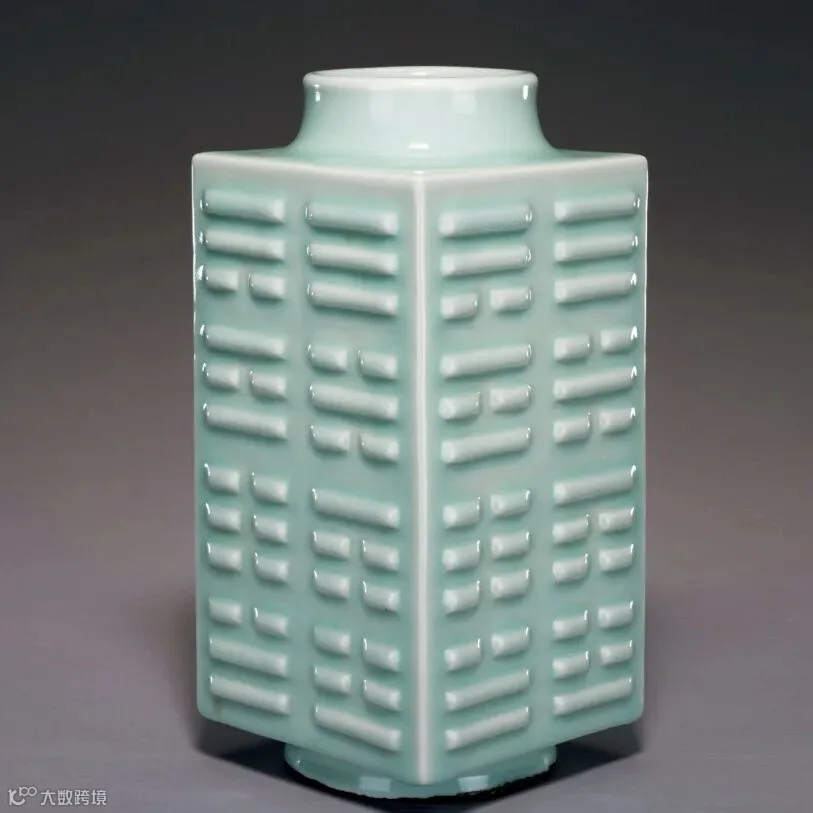 琮式瓶的八卦纹饰源自《周易》"观象制器"的造物传统,粉青釉色延续着宋代理学"格物致知"的求道精神。本品造型仿自先秦礼器玉琮,始见于宋代,清代乾隆朝以后成为官窑传统器型,乃清宫陈设用器,其后历朝皆有烧制,清档称为“四方八卦瓶”。拍品形制古雅,比例匀称,工艺繁复。通体施粉青釉,釉层肥润盈亮,釉色清新淡雅,器身四面模印八卦纹,纹样清晰工整。底落“大清光绪年制”六字双行楷书款。