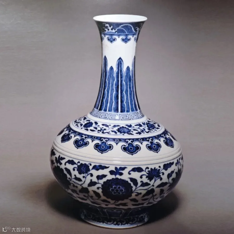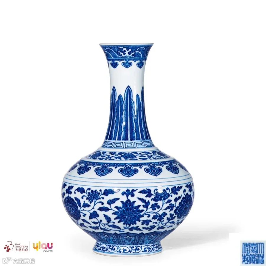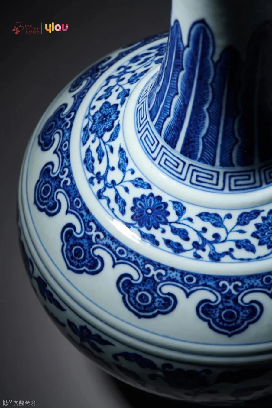 拍品器形端庄,丰腴优雅。口部饰以海水波浪纹及贯套如意纹一周,下承蕉叶纹及回纹,肩部绘缠枝花卉纹与贯套如意纹,与口部纹饰相呼应。腹部凸起双弦纹下绘单层缠枝莲为主题纹饰,胫部绘变形莲瓣纹,足外绘卷草纹。整器釉面光润,青花色泽明快,装饰层次清晰,绘画技法娴熟,为同类器中之佳作。根据器形和纹饰的不同,此类赏瓶可分两种:其一为雍正朝初创之作,腹部上丰下收,主题纹饰为单层缠枝莲纹,肩部亦有三组凸棱,同类器见上海博物馆及北京故宫博物院藏品;另一种为乾隆朝创新之作,腹部浑圆,饰双层缠枝莲纹,且肩部不饰凸棱,足际起唇边一周。