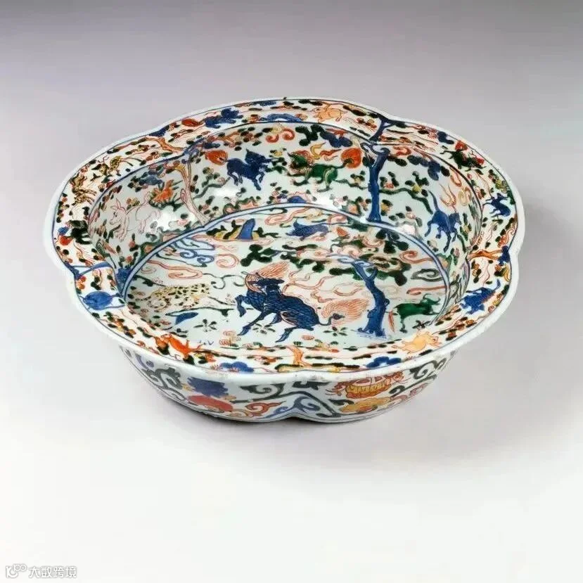 万曆五彩瑞兽图花口折沿洗的装饰美学更具象征意味。其四次入窑的烧造工艺,暗合《易经》"四象生八卦"的宇宙生成论。洗心麒麟纹既取《礼记·礼运》"麟凤龟龙,谓之四灵"的祥瑞意象,又以炽烈的红绿对比彰显晚明"尚奇"的审美趣味。这种"错彩镂金"的装饰风格,与书房中素雅的文房用具形成张力,恰如董其昌所言"绚烂之极,归于平淡"的艺术辩证法。