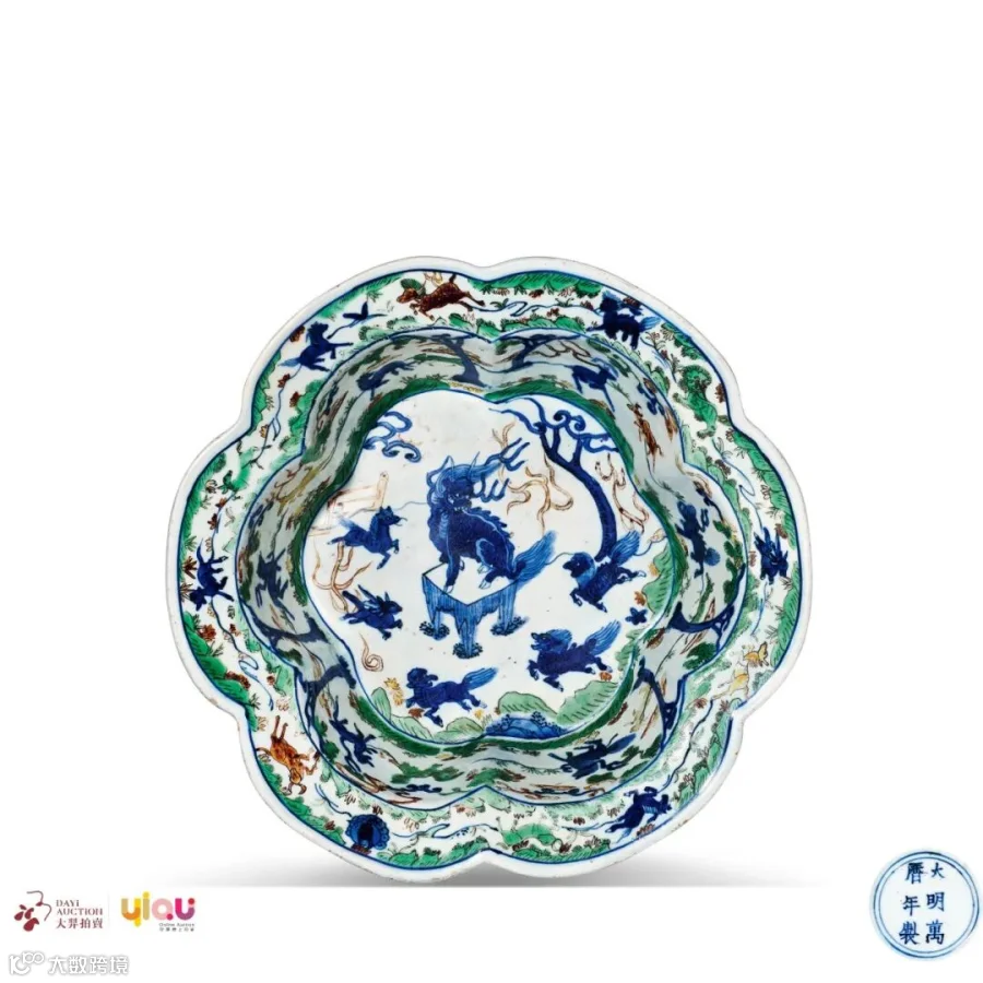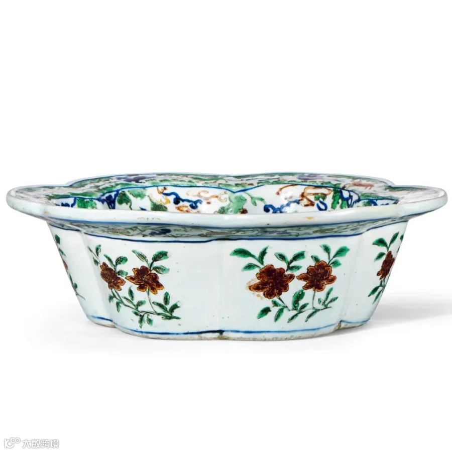 万曆时期宫廷对五彩器需求十分浩繁,其大红配大绿的鲜艳搭配是为了向世人展现宫廷皇室生活的极度奢华生活。此件花口洗为当时青花五彩官窑中的一件代表作。洗呈六瓣花口形,优雅端庄,胎体厚实,洗心以青花五彩绘麒麟瑞兽纹饰,整器画面设繁密华丽,红绿二彩浓妍相映,青花幽丽匀净,转换自如,绝无重复迭杂之处,画工精湛,笔触洒脱,凸显万曆时期粗犷朴丽之风。