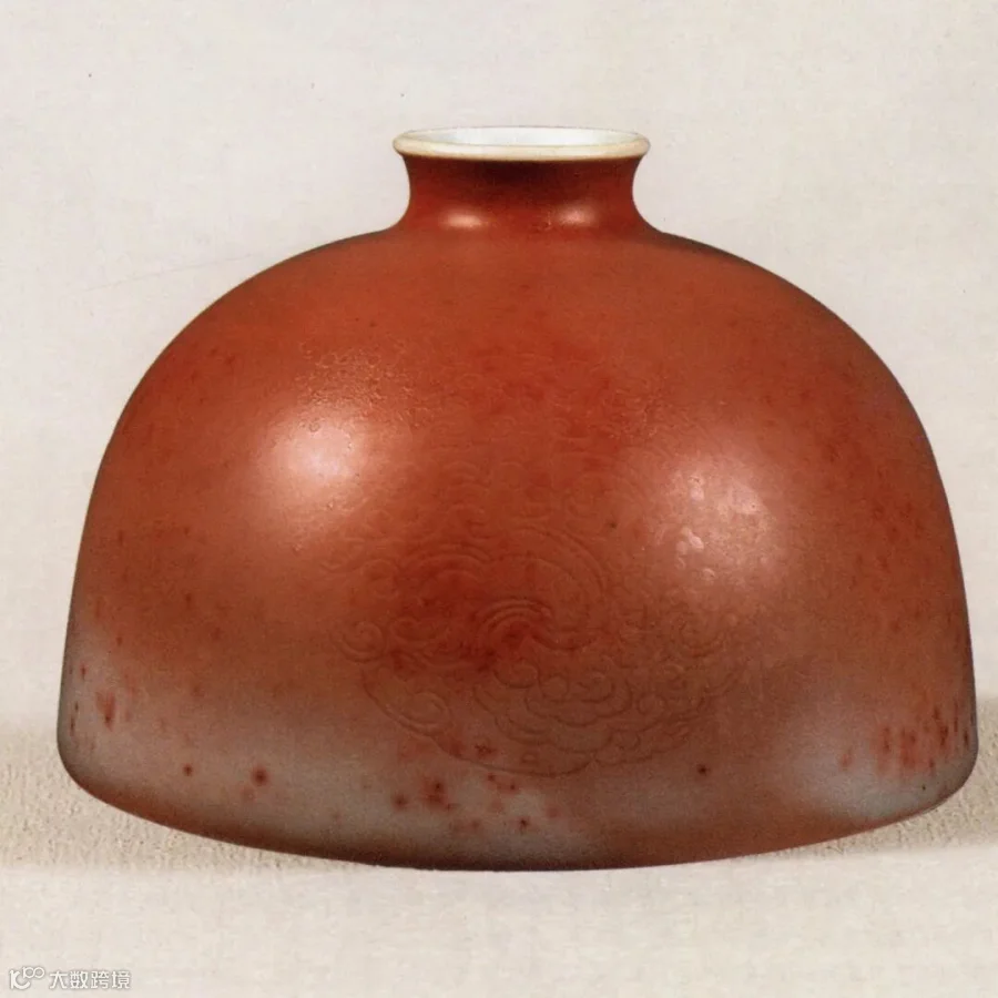 书房空间的营造暗合《周易》"观物取象"之理。明人高濂《遵生八笺》所言"书斋宜明净,不可太敞",正体现道家"大制不割"的辩证思维。lot809康熙豇豆红釉太白尊的诞生,恰是这种宇宙观的完美具象。其造型取法李白诗酒风流,釉色如春日桃花浮浪,釉面隐现的"苔点"恰似《庄子》所言"天地有大美而不言"的自然肌理。这类仅供宫廷的秘色瓷,以"天成"之釉色呼应文人"不求工巧而自工"的审美理想,将道家"自然无为"的哲学化为可触可感的器物之美。