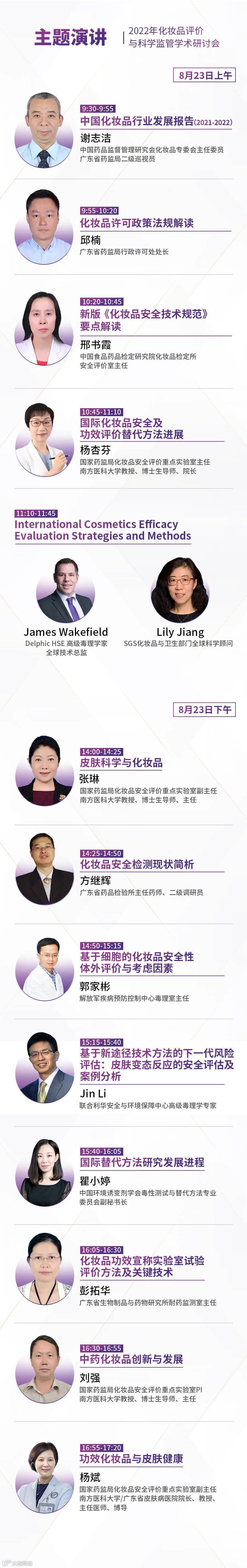 本次学术研讨会特邀来自广东省药监局、国家药监局化妆品重点实验室、国内高等院校权威学者、化妆品行业组织及国内外知名化妆品企业的专家代表,分享极具研究价值与指导意义的主题演讲。