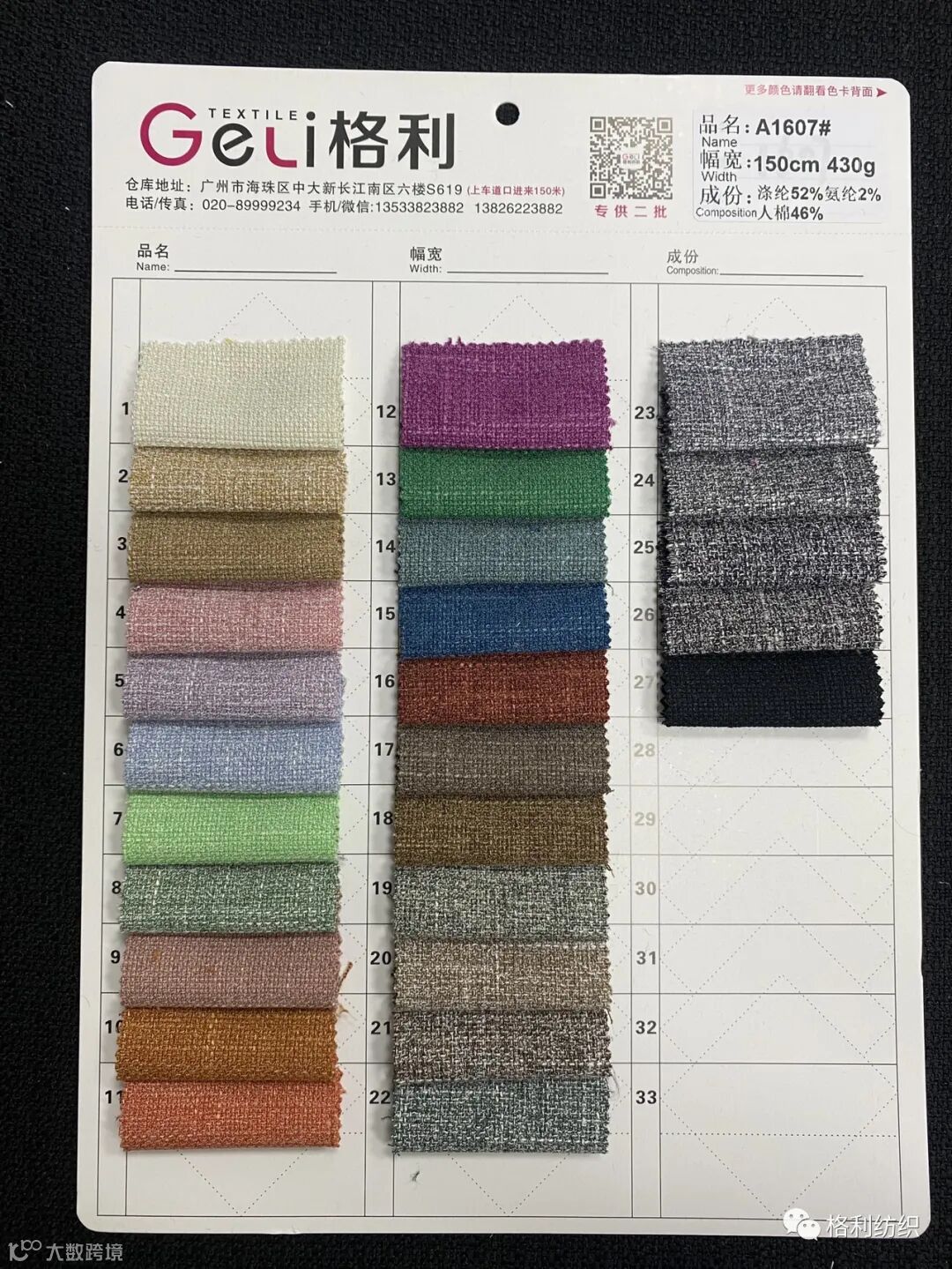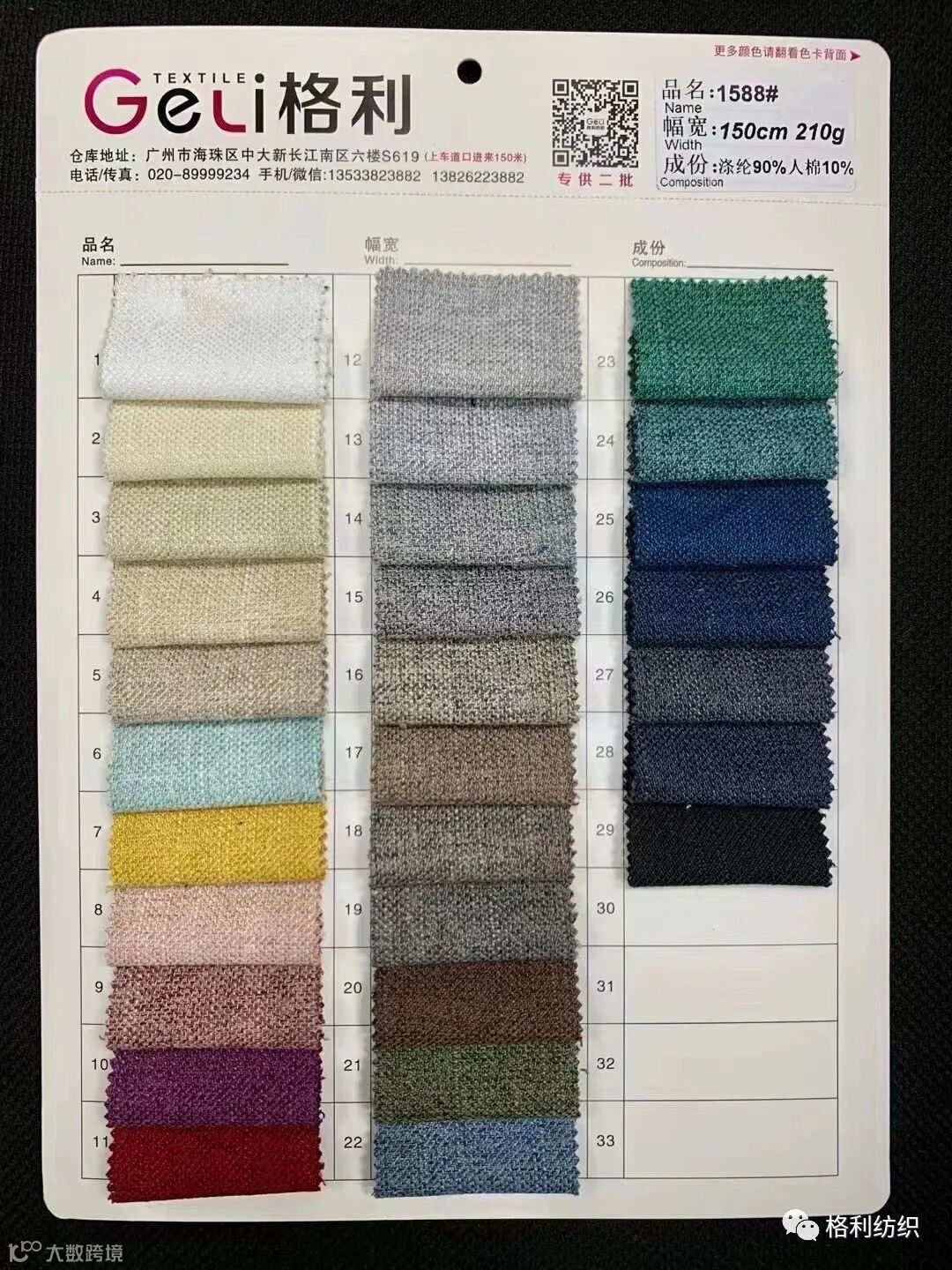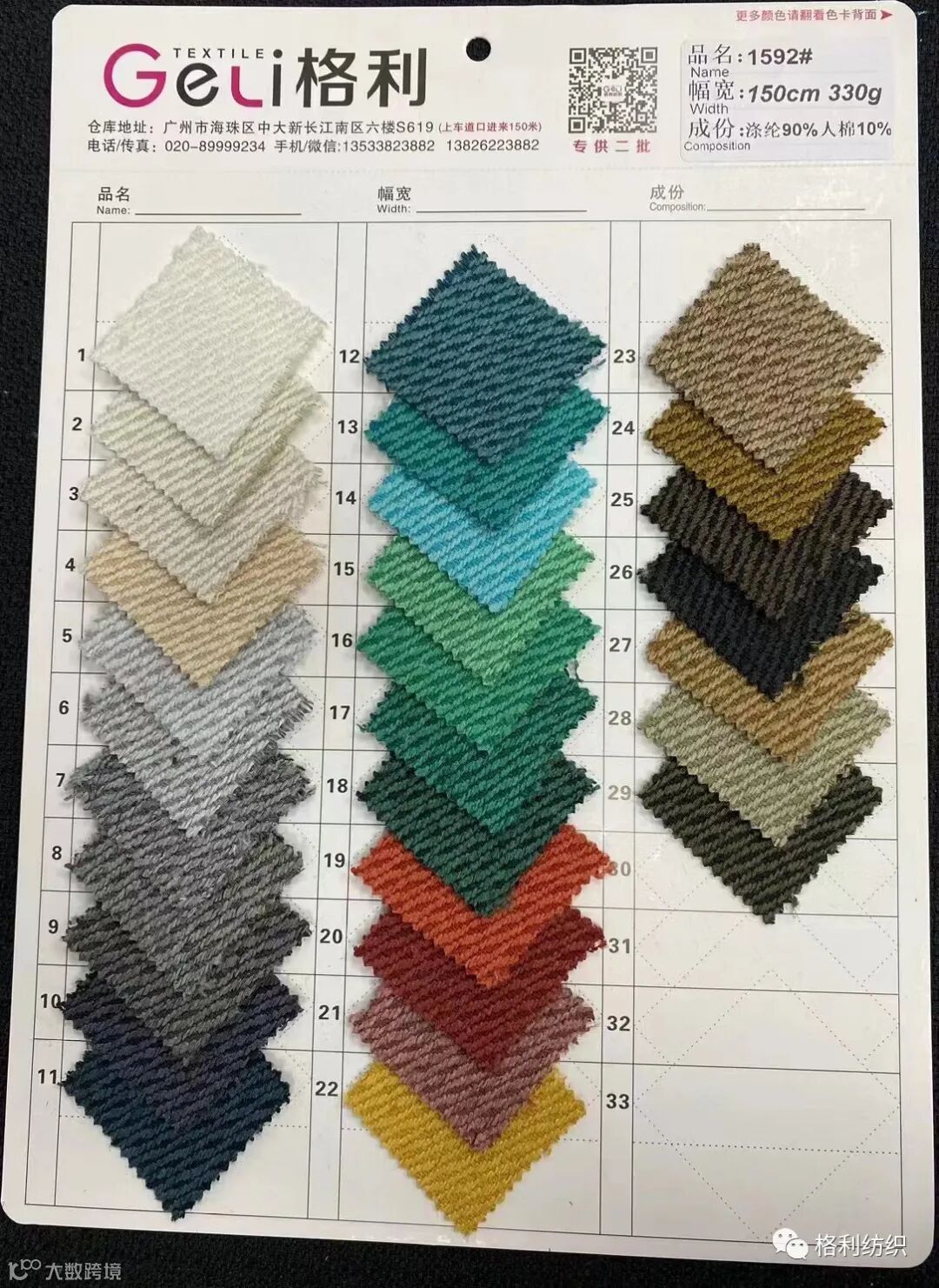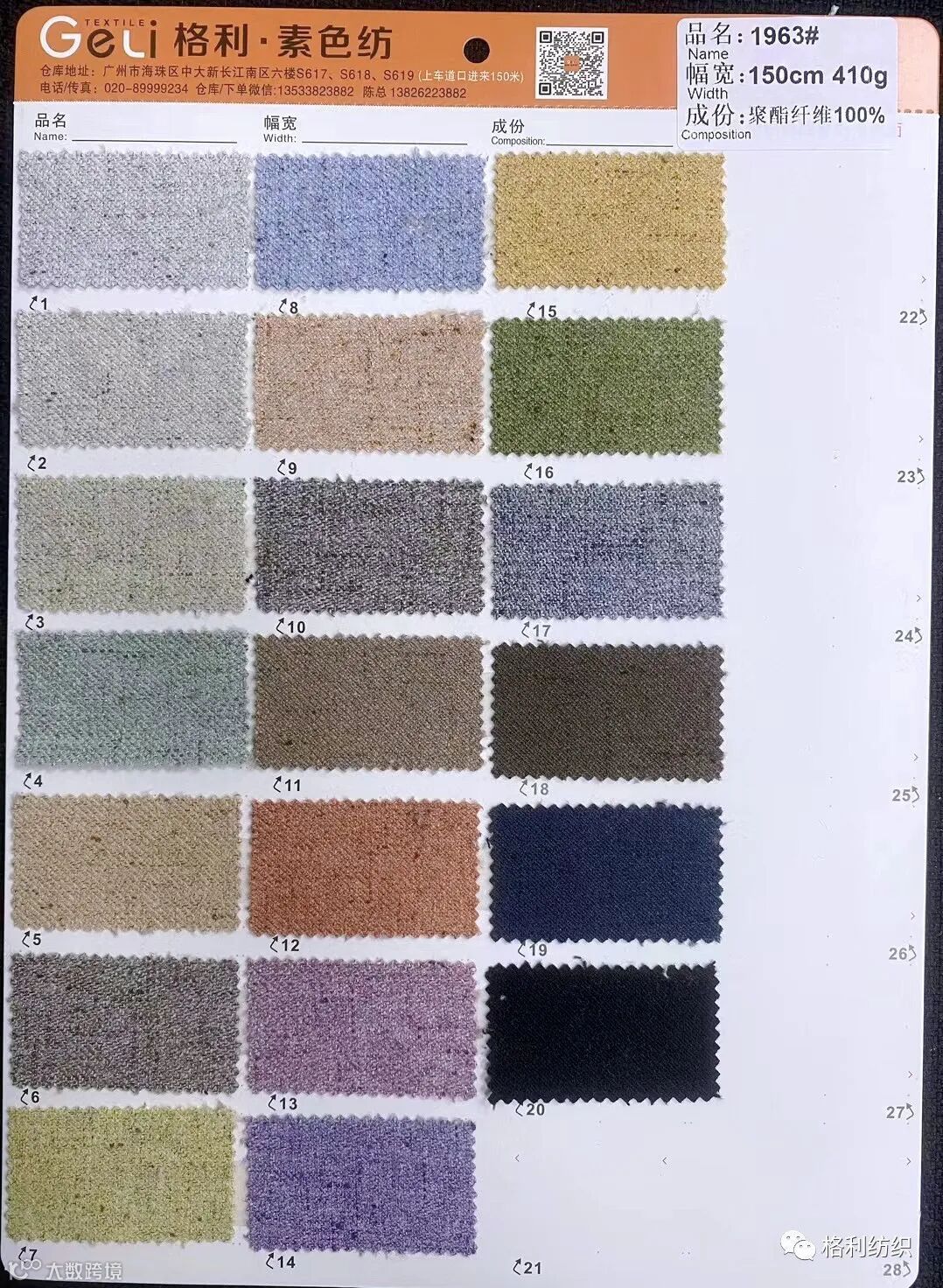 感谢您关注广州新格利®纺织 ,我公司专业从事面料生产开发,TR色织格条,素色小香风,TR双色乐丽丝系列。欢迎广大客户前来咨询采购!地址:广州市海珠区中大新长江北区三楼N3183。☎️电话020 89999234 手机:13826223882