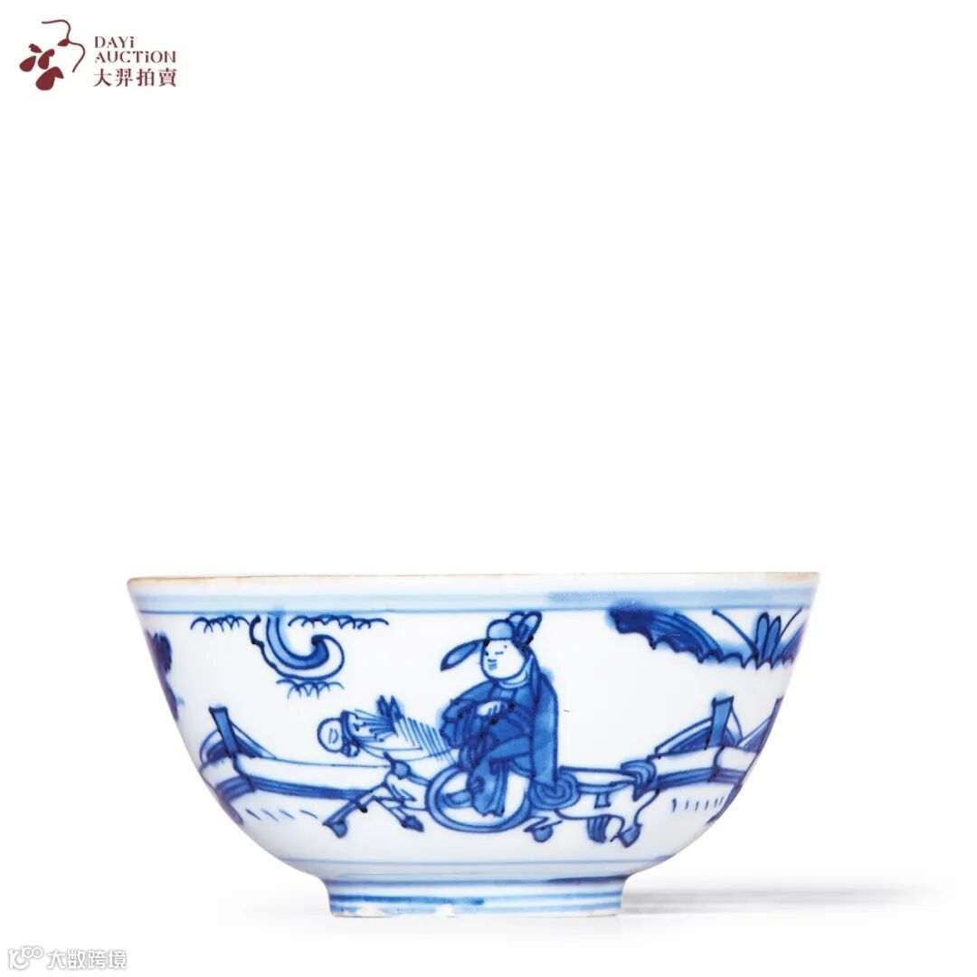 敞口,弧腹,圈足。造型简洁,胎质细腻洁白,釉面柔和温润,外壁以青花绘携琴访友图,远山近柏,云气缭绕,院庭悠悠,碗心绘高仕携灵鹿望月,惬意雅致,文人气息浓厚。整体布局疏密有致,青花发色淡雅,时代特征明显。底书“福寿康宁”四字楷书款,属晚明常见款识。