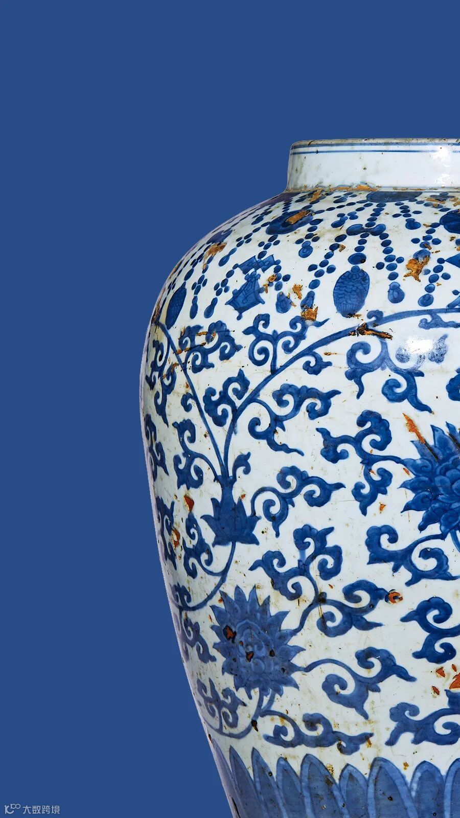 万历一朝所出大罐,往往竭众匠之力尚难为之,更有烧造难成之苦,百中不得一二之虞。许之衡《饮流斋说瓷》中曾有记载:“转枝莲托百宝或转枝莲托百寿字,此种奇制,配置极难”。全器青花发色纯正,明艳清丽,纹饰构图饱满,层次清晰,绘工精致,赏心悦目,笔触率意,风格热烈奔放,生动传神,极具万历青花天真烂漫,草昧初开的独特韵味。