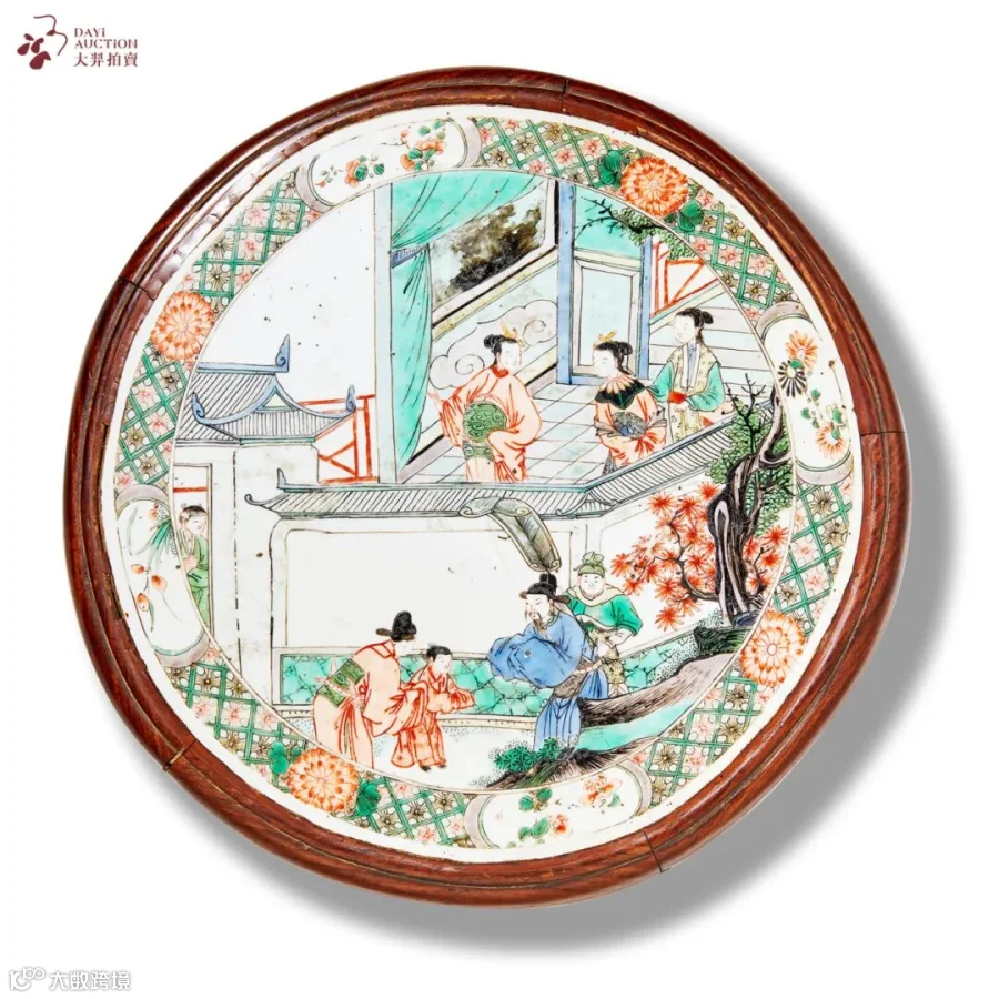 砚屏呈圆形,外侧镶嵌硬木为框,文雅别致。屏心以五彩绘访友图,屋宇高阔,绿树葱郁,红叶潇潇,诸人站立阶前,作揖相对,庭院幽雅,二人悦目相谈,一派恬然之景,群卉点缀其中,生机磅礴, 外绘一周锦地开光四季花卉纹,布局考究严谨,笔触细腻洒脱,设色柔和淡雅,施彩古雅妍美,人物神情俱佳,动态刻画细致入微,勾勒笔法流畅,气息高雅闲逸,具有浓厚文人气息。