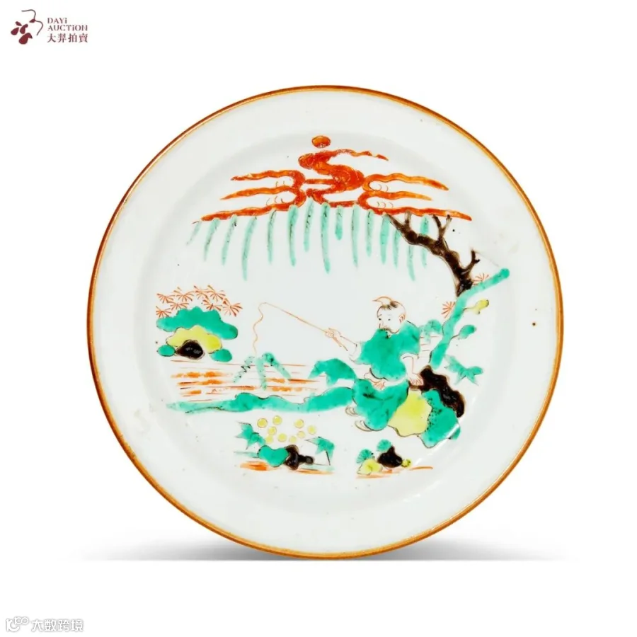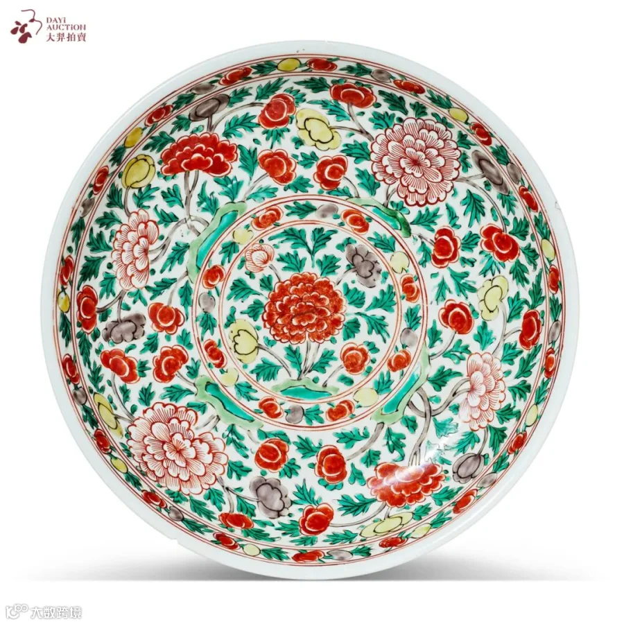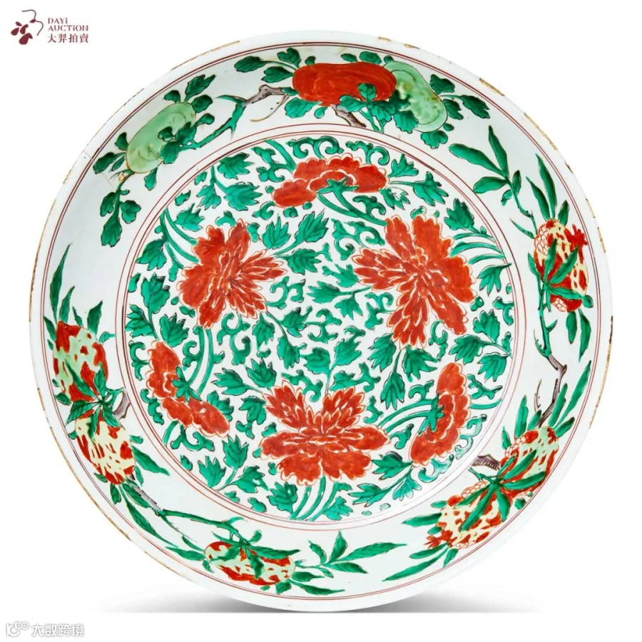 拍品敞口,浅弧腹,双圈足,露胎处可见胎体坚实细腻。盘内以五彩绘三多瑞果纹饰,寓意“多子、多福、多寿”,盘心双圈内绘花卉纹,以红彩填绘花朵,绿彩勾勒枝蔓,一幅生机盎然之景,色泽浓妍,对比鲜明,外壁绘三组折枝花绘,与盘心纹饰相映成趣,相得益彰。全器形制端稳,绘笔豪放舒畅,色彩浓艳凝厚,时代特征鲜明。