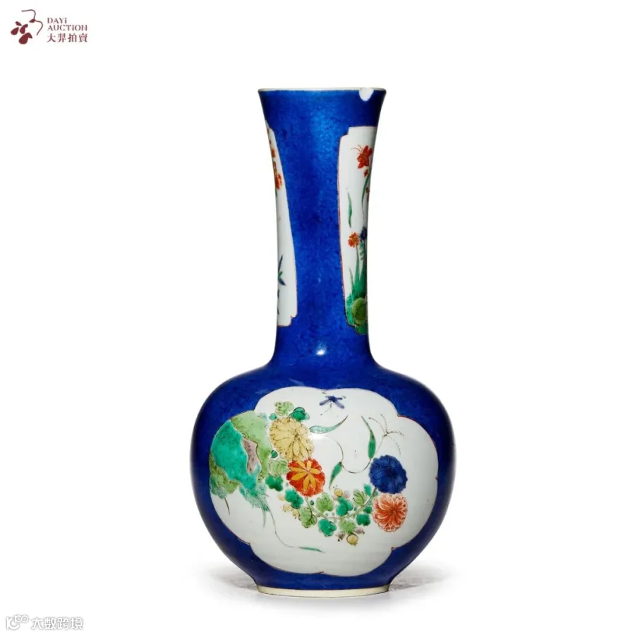 清康熙 洒蓝地开光五彩蝶恋花纹长颈瓶