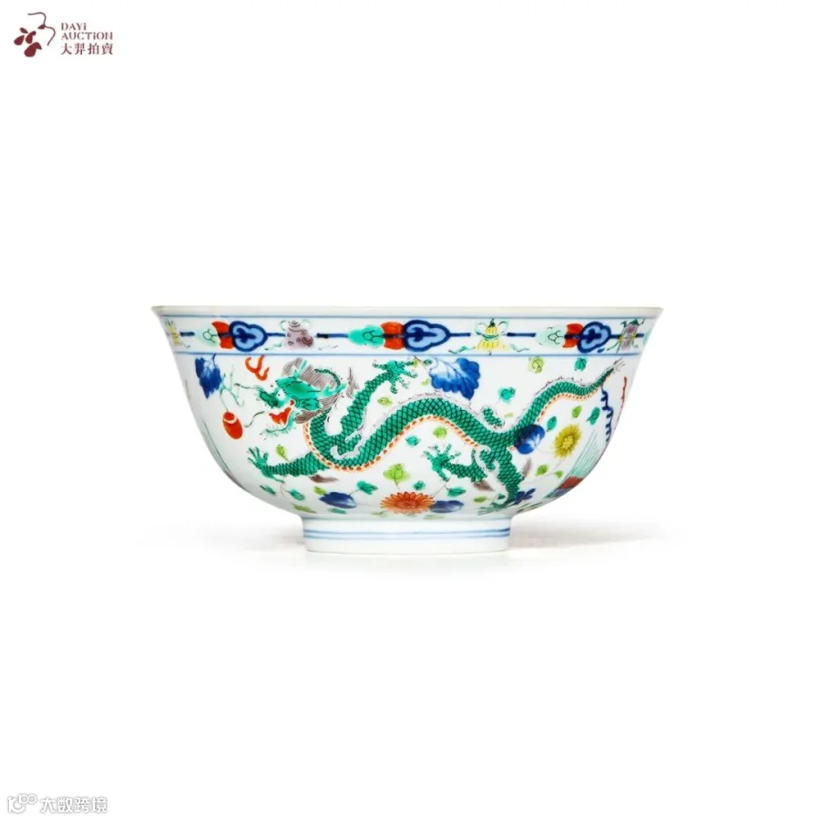 拍品侈口,弧腹较深,圈足。胎质细腻,釉质润泽,釉面匀净。碗内底以红彩绘出五爪龙戏宝珠图案,龙身周边青焰围绕,碗外部近口沿处以紫、黄、绿彩绘一周八宝纹,以青花五彩绘出双龙双凤,基本呈中心对称,双龙主体颜色分别以红、绿彩绘出,双凤振翅凤首朝下,龙凤身边装饰以缠枝花卉,精美绝伦。龙凤成双成对,寓意吉祥。此类碗始见自康熙朝,后成官窑经典器型,每朝必烧,两百年来造型、纹样基本保持不变。