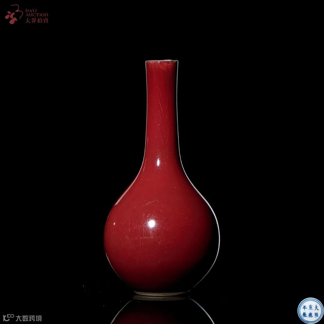 瓶直口,细长颈,垂腹,腹部下方渐敛,圈足。形制周正秀颀,线条流畅简洁。外壁通施霁红釉,釉面肥腴滋润,釉色鲜艳匀净,口沿一道“灯草边”,颜色对比鲜明,气韵典雅怡人。瓶里及足底均施白釉,外底心青花双圈内书“大明宣德年製”六字三行楷书款,是为一例文房佳品,赏玩俱佳。