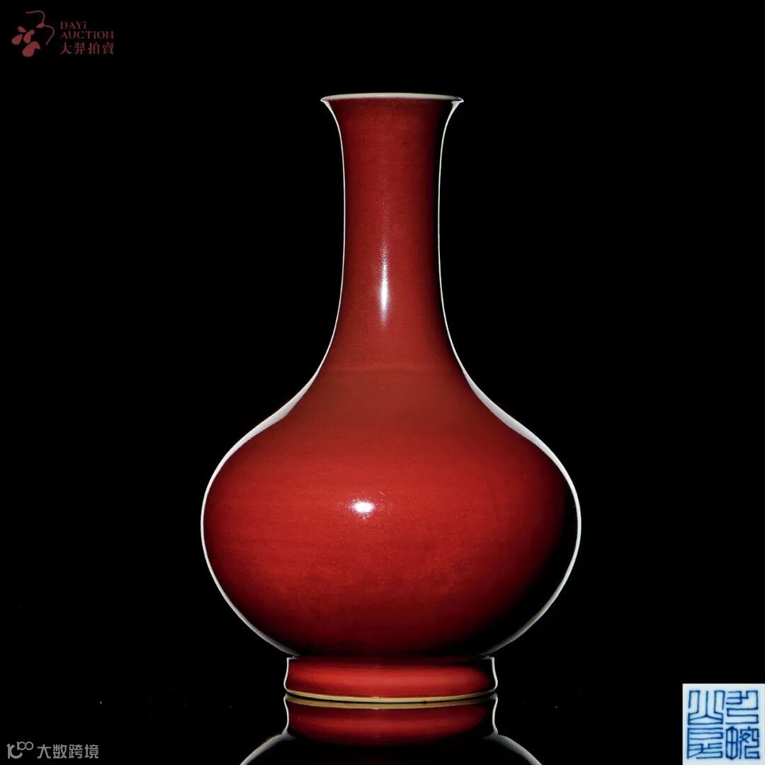 郎窑红釉为康熙时仿明宣德宝石红釉的品种,为熙四十四年(1705年)至五十一年(1712年)时任景德镇御器厂督陶官的郎廷极复烧明代永宣时期高温红釉,郎红釉瓷器一经诞生,便被时人称赞。其色如初凝牛血一般鲜红浓艳,乾隆御制诗中曾有“世上朱砂非所拟,西方宝石致难同”的吟咏,乃清代单色釉隽品,一直为藏家所重。 本品撇口束颈,弧腹及底内收,至足部微撇,下承圈足,造型挺拔,康熙瓷器中流行式样,端庄大方。外壁满施郎红釉,釉面玻璃质感强,清澈透亮,色泽均匀浓艳,垂釉近足,特征鲜明。