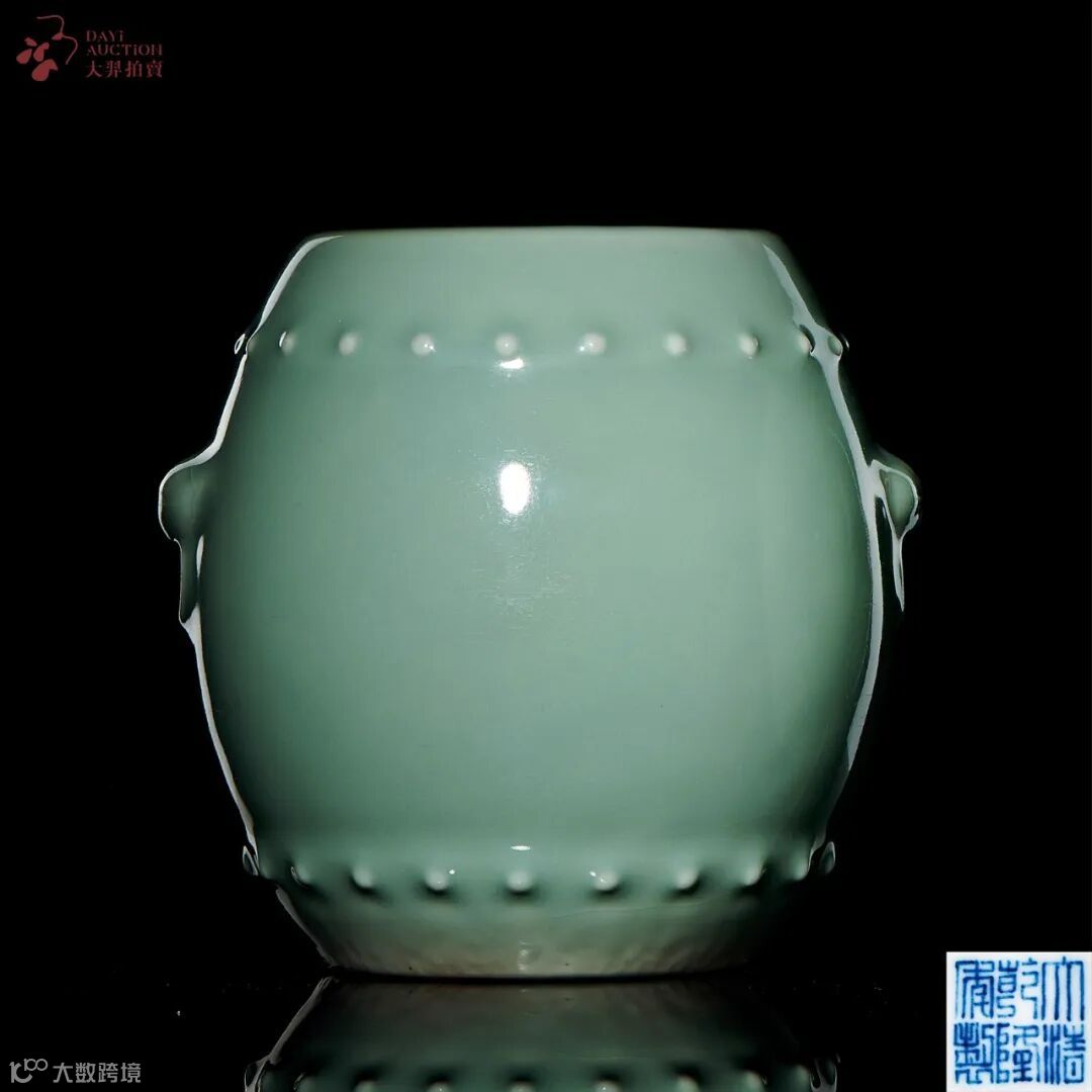拍品呈鼓式,敛口,鼓腹,颈部腹部各饰一圈凸起鼓钉,肩部两侧塑对称衔环铺首,玉璧形底。整器通施豆青釉,釉色淡雅,釉质温润。底心内凹,书青花“大清乾隆年製”六字三行篆书款。鼓钉罐为清代官窑传统器形,创制于清雍正时期,其后三朝延续烧造,道光以后不见制作,清宫档案中亦名“花囊”,当属宫廷花器。
