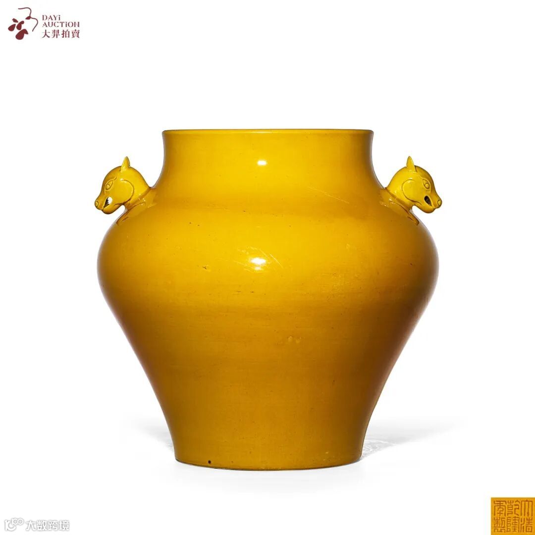 本品与台北故宫博物院藏品相同,为清代御窑仿明代弘治朝同类器之力作,属宫廷少见的大尺寸黄釉器皿。造型古雅端庄,气势恢宏。肩部饰双牺耳,雕工精细,栩栩如生。内外满施娇黄釉,釉质柔亮丰腴,静穆深沉。器底釉下暗刻“大清乾隆年製”六字三行篆书款,不为多见。低温黄釉器创烧于明初景德镇官窑,此后各朝多有烧制。因当时以浇釉法施釉,故有「浇黄」之称,又因其呈色娇嫩,而得「娇黄」之美誉。