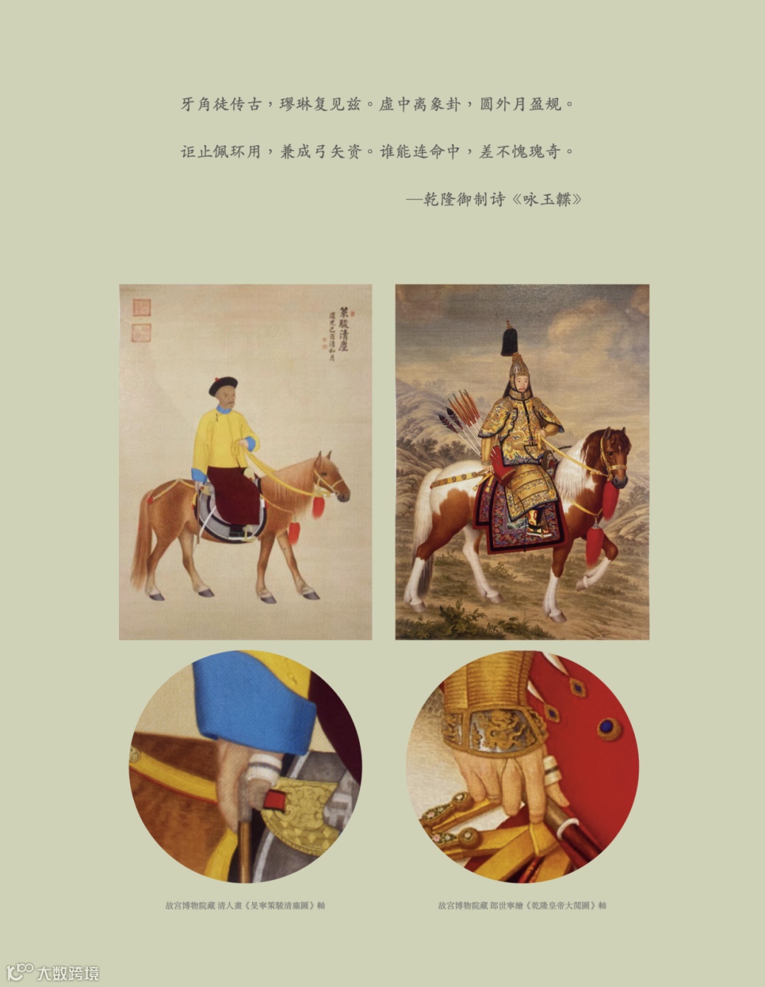 其中一件或于乾隆皇帝有非常特殊的意义,自少年时代便为其所用。乾隆十七年,感慨陪伴自己三十年的这枚扳指,清高宗为之写下《角歌》,赞其“指挥如意淳风穆”“内外如一刚不皴”,哪怕置于群玉之中,气象穆然,足以镇之”。这堪达汉扳指是他所珍视的“旧物”,虽不华丽,却是“本色衣衫胜缨绂”(缨绂,指冠带与印绶)。堪达汉扳指淳朴、耐用,气象穆然,用之日久,更代表着民族的历史与立根之本。