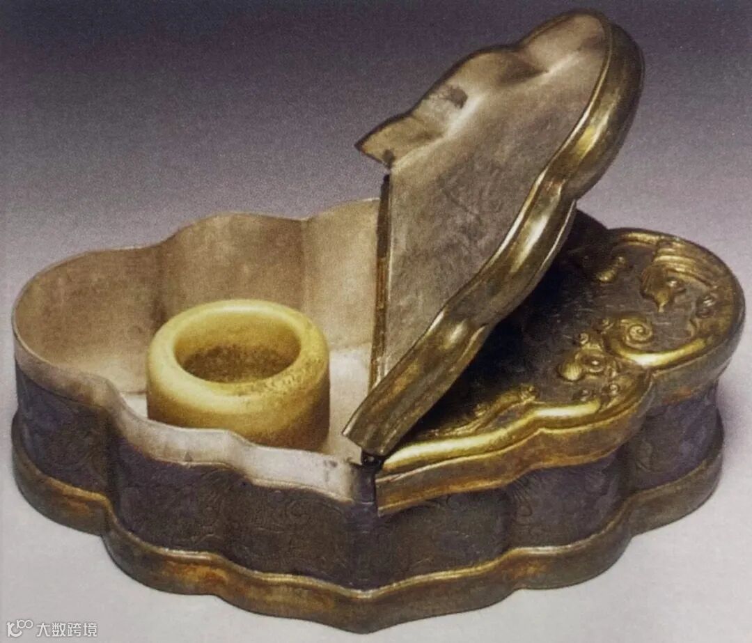 这枚乾隆皇帝惯常使用,且如此珍视的堪达汉扳指,或许便是前述多幅画作中所绘之物。今台北故宫博物院藏一骨雕扳指(故雕000241),收贮于精美的银镀金流云宝相花双联盒中,有可能便是乾隆当年的心头好。