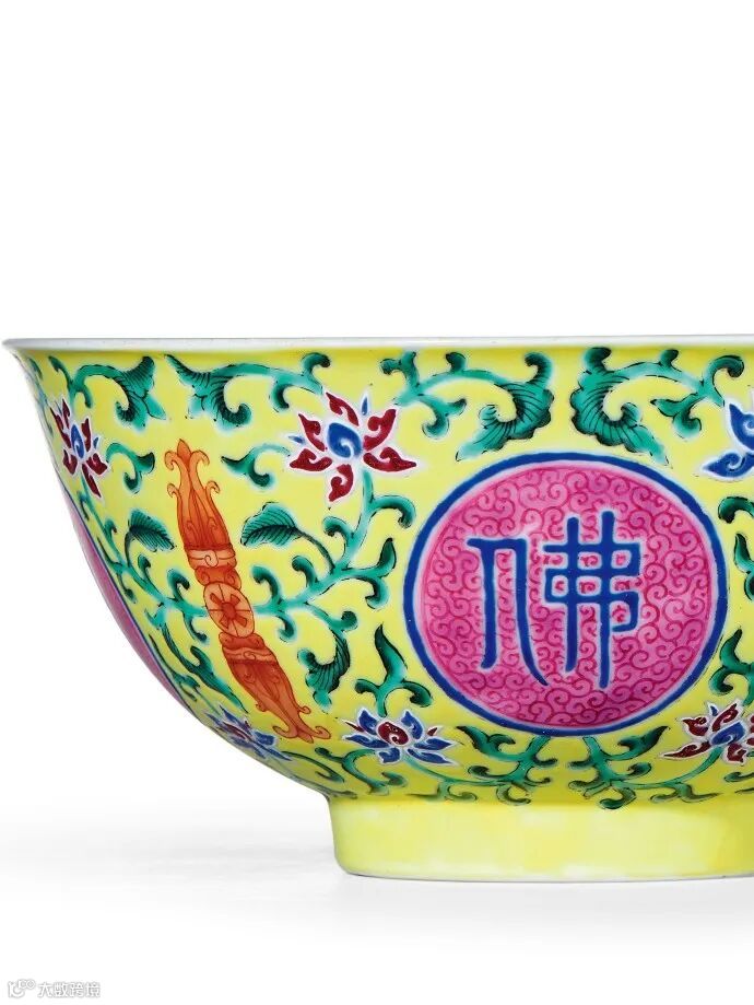 佛日长明碗,外壁以柠檬黄釉为地,其上以洋彩绘制缠枝莲托宝杵、洋花纹,间饰等距四圆形开光,内书 “佛日常明” 四字,并以四组缠枝宝相花间隔。此类瓷器始烧于乾隆元年,自乾隆至道光皆有烧制,道光以后较为鲜见。