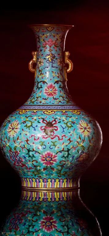 “八吉祥”即佛家八宝,为佛前供器,分别由法轮、法螺、宝伞、白盖、莲花、宝罐、金鱼、盘长八件组成。每件供器含义不同,法轮代表佛说大法圆转,万劫不息;法螺代表菩萨果妙音吉祥;伞代表张弛自如,曲覆众生;华盖代表遍覆三千,净一切乐;莲花代表出浊世而无染;罐代表福智圆满,具完无漏;鱼代表坚固活泼,能解坏劫;盘长代表回环贯彻,一切通明。乾隆帝喜好吉祥纹饰,八吉祥纹自然亳不例外,画在瓷品作饰,绝不违和,瓶颈以如意作耳,取其顺心之意,故本瓶所带吉祥、如意之兆,正合帝意。