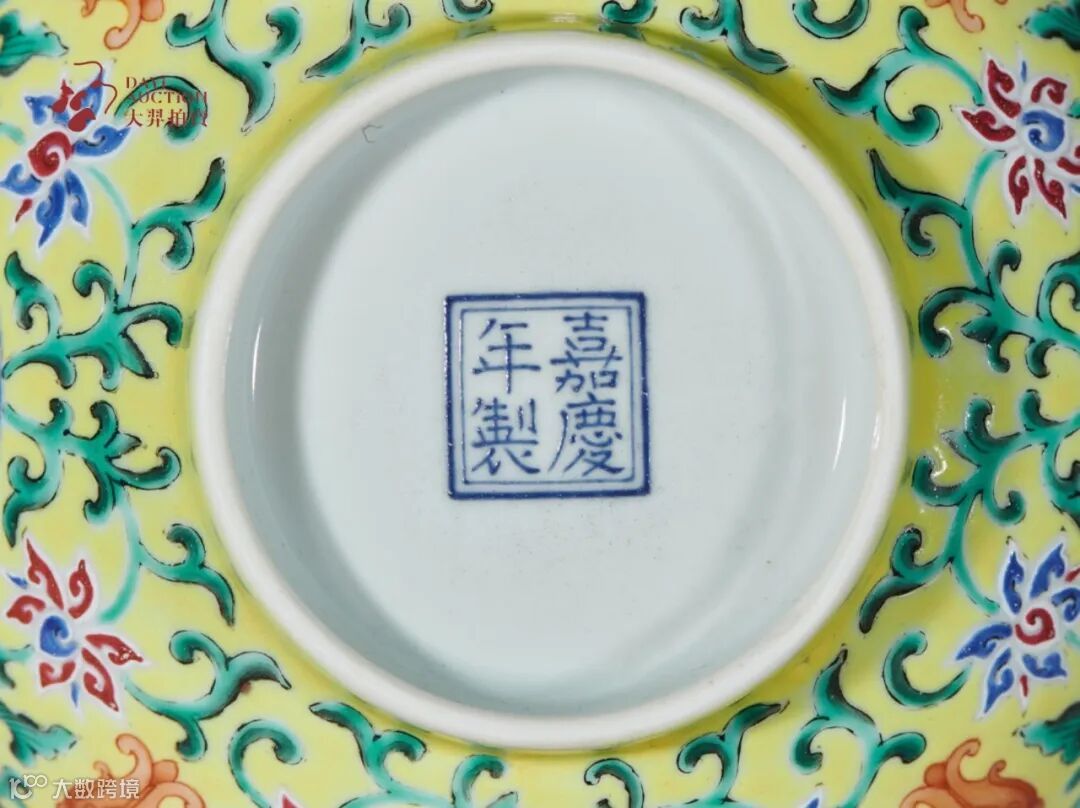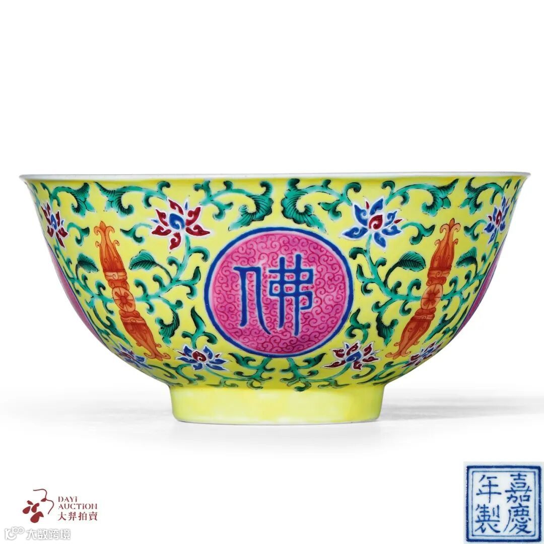 此式“佛日常明”碗创烧自乾隆御窑,据《清宫造办处活计清文件》记载,“乾隆元年十二月”二十二日,七品首领萨木哈将碹得画各样花卉木样四件并原样盘二件持进,交太监毛团呈览。奉旨:准照画‘佛日常明’字黄地青番花盘样式作七寸盘、五寸盘,大碗、小碗俱照此花卉样做。钦此。”自乾隆至道光皆有烧制,道光以后较为鲜见,本品属嘉庆御窑沿烧之作,外壁以低温柠檬黄釉为地,其上以洋彩绘制缠枝莲托宝杵、洋花纹,间饰等距四圆形开光,以蓝料彩绘边线,内书“佛日常明”四字,并以四组缠枝宝相花间隔,纹饰布局对称,绘画工整细腻,色彩浓艳华美,宫廷气息氤氲,与乾隆洋彩雍容华丽之貌毫无二致。底部蓝料彩书“嘉庆年制”四字双行楷书款,等级极高。