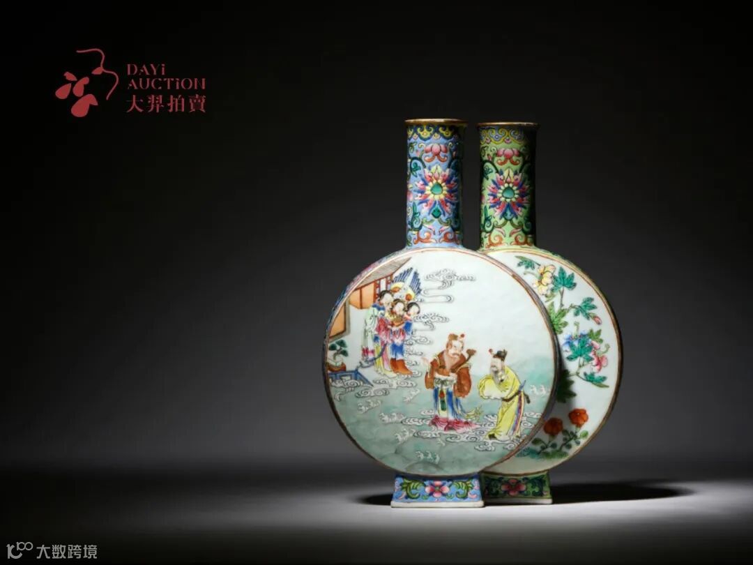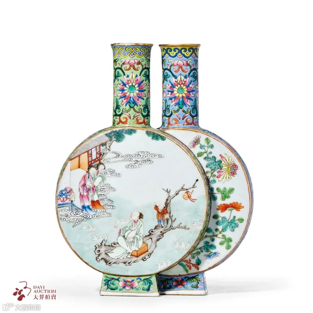 本品呈双联形,工艺精湛,设计精巧,扁圆形腹,直口,方胜式矮足。瓶颈部、两侧及外足处分别以秋葵绿地及蓝彩为地,其上粉彩满绘缠枝宝相花卉纹,花形秀丽饱满,风格别具,腹部两侧各设开光,内施白釉为地,釉色细润匀净,其上粉彩绘画唐明皇游夜宫图,画中明皇身着黄袍,作揖恭敬而立,侧旁道长长须白鬓,气度翩翩,二人腾云驾雾欲向月宫而去,忽而抬眼,又见云深处似现广寒清虚府,三位彩衣仙子翩跹而出,面容姣好,身姿窈窕,别有一番意趣。另侧绘则绘仙人乘槎图,画中浮槎飘忽水面之上,老树枯丫,浮绕于四海,船头系葫芦,随浪花飘动,羽人栖息槎上,后随小童,昂首遥呼,云边停驻二妇人,仪态雍容,似欲攀舟。