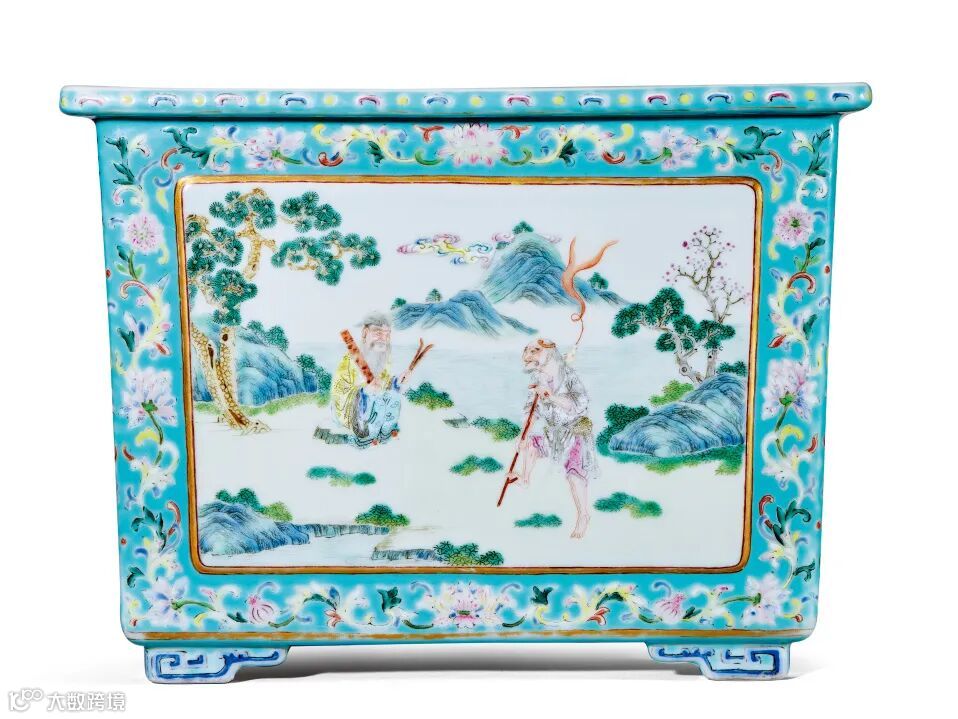 盆成对,折沿,四方倭角,斜直腹,下承四足。通体施松石绿釉,色泽浓艳,外壁绘粉彩缠枝花卉作地,四面设方形开光,以金线作框,内饰白釉,其上粉彩绘八仙人物图,画面中苍松斜生,硕杆虬枝,松荫下见八仙两两相伴,各持法宝,昂首仰观,众仙神情精妙,仙风道骨尽显无遗。画面以浅绿彩衬托绿草如茵,以淡青色描绘水波潺潺,留白之处又绘远山,亦衬彩云,以示天际辽阔、云气飘渺,平添神秘之感。