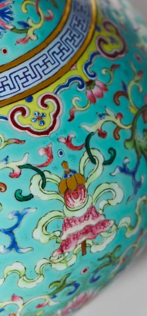 瓷器纹饰如同一种特殊的法典,蕴含着丰富的文化内涵与权力象征。八吉祥纹作为佛教的八种吉祥象征物,即法轮、法螺、宝伞、白盖、莲花、宝瓶、金鱼、盘长,被广泛应用于宫廷瓷器装饰中。此次春拍的道光松石绿地八吉祥双耳瓶,瓶身装饰的八吉祥纹,庄重而肃穆。在宫廷语境下,八吉祥纹不仅仅是宗教符号,更代表着皇权与神权的结合。皇帝以天子自居,借助佛教的神圣寓意来巩固自身统治,瓷器上的八吉祥纹仿佛在向世人昭示,皇权如同佛教教义一般,至高无上且永恒不变。