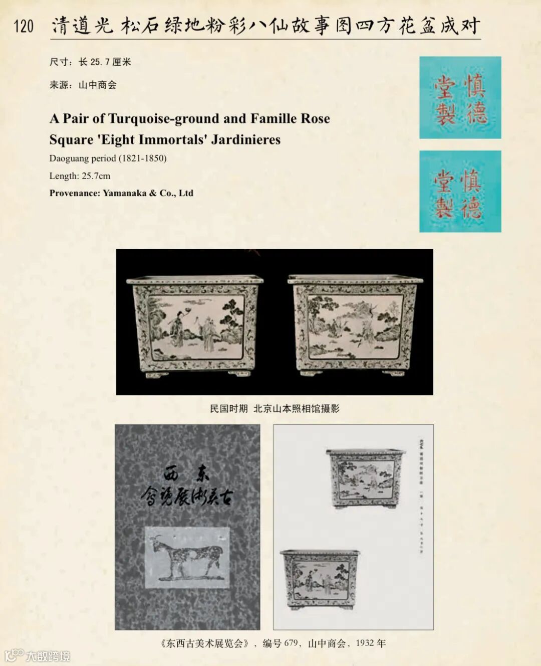 拍品底部分别有三张标签,其中最为重要的为The Minneapolis Institute of Arts美国明尼阿波利斯美术馆的贴标,贴标信息中显示为私人借展,根据资料查阅此对花盆在1984年至1995年于此处展览。借展人为美国芝加哥知名私人藏家ROBERT B. AND BEATRICE C. MAYER。此对花盆收录于山中商会1932年的《东西古美术展览会》图录,后来又被山中商会美国芝加哥分店店长永谷寿三于1967年出售给当地知名藏家,在金立言博士的《东瀛遗珠-山中商会及日本旧藏名窑瓷器》一书亦有收录。