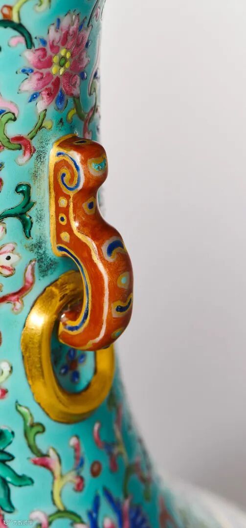 纵观十八世纪宫廷御瓷,运用此法,俱为品格不凡者,足见此件作品之罕有珍贵。参考故宫博物院清宫旧藏三例,载于《故宫博物藏文物珍品全集.珐琅彩.粉彩》,香港,1999年,图版115、119、118。另可比较松石绿地粉彩折枝花卉福寿延绵图双龙耳瓶,其耳为双龙,身绘红蝠,但工艺及尺寸类同,售于香港苏富比,2013年10月8日,编号201。另一例也绘云蝠纹及设龙耳,售于香港佳士得,2005年5月30日,编号1500。