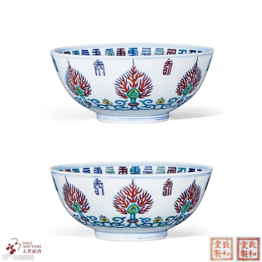 拍品 338 清乾隆斗彩佛花梵文碗,敞口、深腹、圈足,器底书 “致和堂制” 款。外壁绘斗彩缠枝佛花纹,留白处书梵文,字体清秀;内壁口沿处绘细密梵文,排列工整,苍劲有力,器壁主体亦绘对称青花缠枝佛花纹。梵文,作为古印度的一种文字,随着藏传佛教的传入,在明清两朝的青花器中十分盛行,常被用于瓷器装饰,以表达礼佛祈福之意。