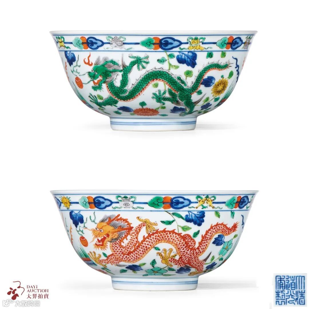 拍品侈口,弧腹较深,圈足。胎质细腻,釉质润泽,釉面匀净。碗内底以红彩绘出五爪龙戏宝珠图案,龙身周边青焰围绕,碗外部近口沿处以紫、黄、绿彩绘一周八宝纹,以青花五彩绘出双龙双凤,基本呈中心对称,双龙主体颜色分别以红、绿彩绘出,双凤振翅凤首朝下,龙凤身边装饰以缠枝花卉,精美绝伦。龙凤成双成对,寓意吉祥。此类碗始见自康熙朝,因纹饰喜庆,深受各代皇帝喜爱,后成官窑经典器型,每朝必烧。