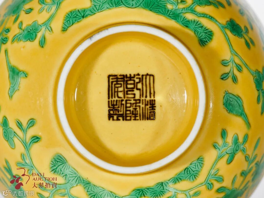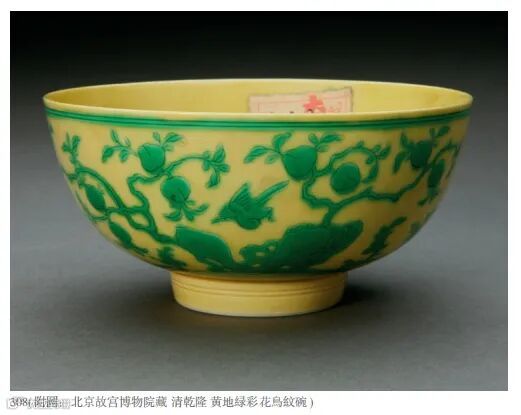 拍品 307 清乾隆黄地绿彩云龙纹碗与 308 清乾隆黄地绿彩花鸟纹碗,敞口、弧腹、圈足,看似寻常的碗型,却因黄地绿彩的装饰而尽显皇家风范。