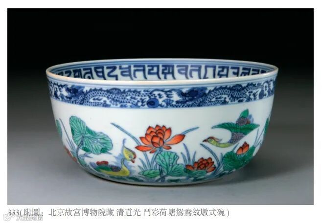 333 清道光斗彩荷塘鸳鸯纹墩式碗,碗型敦厚,胎体致密,敞口略直,深腹,底端内收,卧足。碗心于青花双圈内绘斗彩鸳鸯戏莲图案,内口沿饰青花梵文真言一周,其外绘赶珠龙纹一组,外壁腹部通景绘莲池鸳鸯图案,描绘雌、雄鸳鸯追戏莲池的自然场景,图案清晰,笔触细腻。