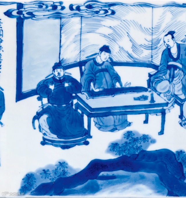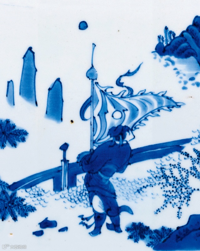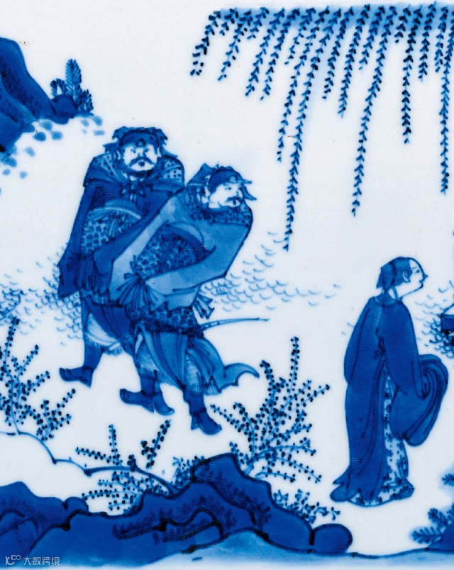 明末清初之际,江南地区市民阶层兴起,他们对家具服用等“长物”所需甚奢,“以天巧人工,徒为传奇耳目之玩”,因此这一时期诸多绘制传神、雕镌精美的书籍版画面世其中以“三国”“说唐”等传奇演义居多,征战场面栩栩如生,引人入胜。晚明学者王世贞言:“古今传奇行于世者靡有不图。”其中人物形象“文图并茂”,被具象描绘于书瓷之上,广为流传。