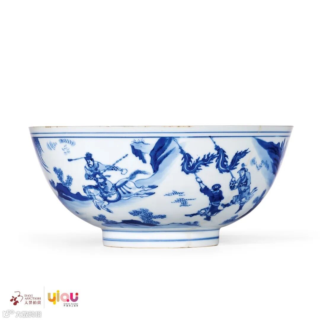 碗敞口曲腹,碗身绘制古代武将征战的场景。碗身所绘画意为隋末唐初“尉迟恭战秦王”之典故,神采英毅小将为大唐秦王李世民,虬髯凶面持单鞭者为尉迟恭,神色焦急一路飞驰者为秦叔宝,整器画面描绘的是隋末群雄纷争,李世民在柏壁大战时收服尉迟恭的故事。
