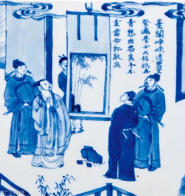 外壁以青花通景描绘十八学士于庭院间会友听琴、观书品画、赏景弈棋等场景,人物的年龄、衣饰、神态各异,但都刻画生动,极为传神。工匠通过青花分水工艺,以浓淡色阶区分表现物件的光影变化,使画面仅着一色,却仍具极强的表现效果,如人物的衣褶、面部表情,以及庭院中的竹石卉草等,都通过青花料的浓淡变化表现得栩栩如生,具有浓厚的文人气息。