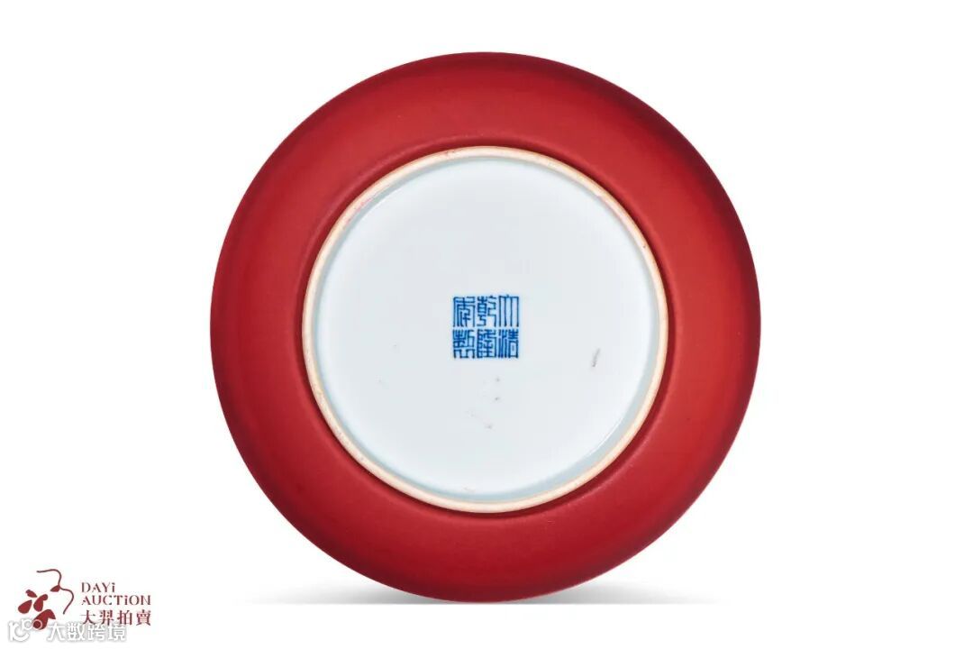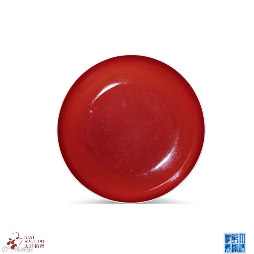 拍品撇口,弧壁,圈足。造型规整,盘形周正,胎体坚硬细密。器身施霁红釉,口沿留有一线“灯草口”,对比鲜明。釉色深沉匀净,釉质光亮,釉面莹润。霁红釉是以铜为着色剂的高温釉品种,其烧造难度较大。道光年间龚洵在所编《景德镇陶歌》中称:“官古窑成重霁红,最难全美费良工。霜天晴昼精心合,一样抟烧百不同。”由此可见霁红釉器烧造之难。拍品釉面肥腴润泽,呈色均匀,为乾隆一朝霁红釉器之佳品。